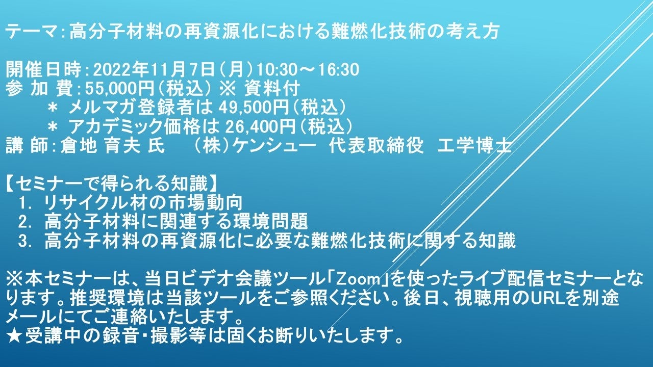 先端技術情報や市場情報を提供している(株)シーエムシー・リサーチ(千代田区神田錦町: https://cmcre.com/ )では、 各種材料・化学品などの市場動向・技術動向のセミナーや書籍発行を行っておりますが、 このたび「高分子材料の再資源化における難燃化技術の考え方」と題するセミナーを、 講師に倉地 育夫 氏 (株)ケンシュー 代表取締役 工学博士)をお迎えし、2022年11月7日(月)10:30より、 ZOOMを利用したライブ配信で開催いたします。 受講料は、 一般:55,000円(税込)、 弊社メルマガ会員:49,500円(税込)、 アカデミック価格は26,400円(税込)となっております(資料付)。