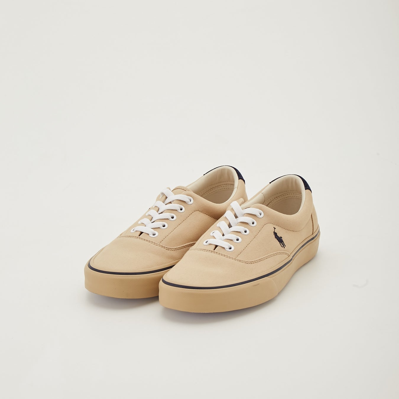 キャンバス素材のアッパーをベージュでカラーリングし、ポイントとなるポロプレイヤーロゴやソールのラインをネイビーであしらい、ジェンダーレスでスタイリッシュな印象に。