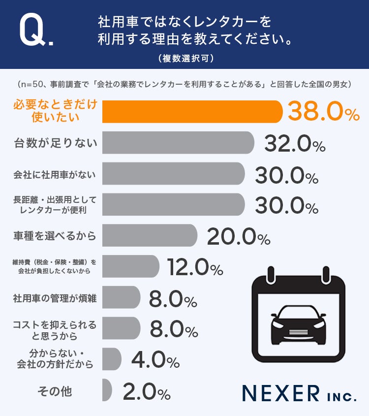 そこで今回は、長期格安マンスリーレンタカー「マンスリーゴー」と共同で、事前調査で「会社の業務でレンタカーを利用することがある」と回答した全国の男女50名を対象に、「レンタカーの利用」についてのアンケートをおこないました。