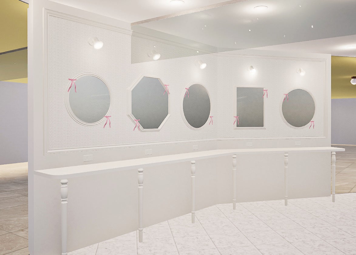 駅直結の入り口には、大きなアンティークミラーを設置。身だしなみを整えられる他、ミラー越しに撮影すればその日のファッションまでフレンチガーリーな世界観で残していただけます。また、メイクアップカウンターには様々な形のミラーを設置。ミラー越しに自撮りをすると、縁に垂れたリボンがポイントになって映えるスポットです。