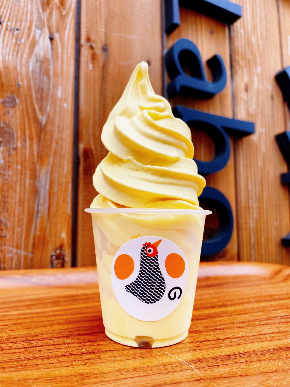 防腐剤・抗菌剤・添加物などは一切使わず自然素材だけを飼料として育てる鶏の卵は驚きの1つ200円!そんな卵を使用したエッグタルトやソフトクリームは卵の味が濃く、濃厚で絶品です。