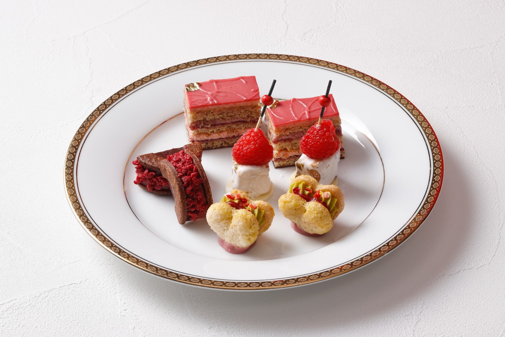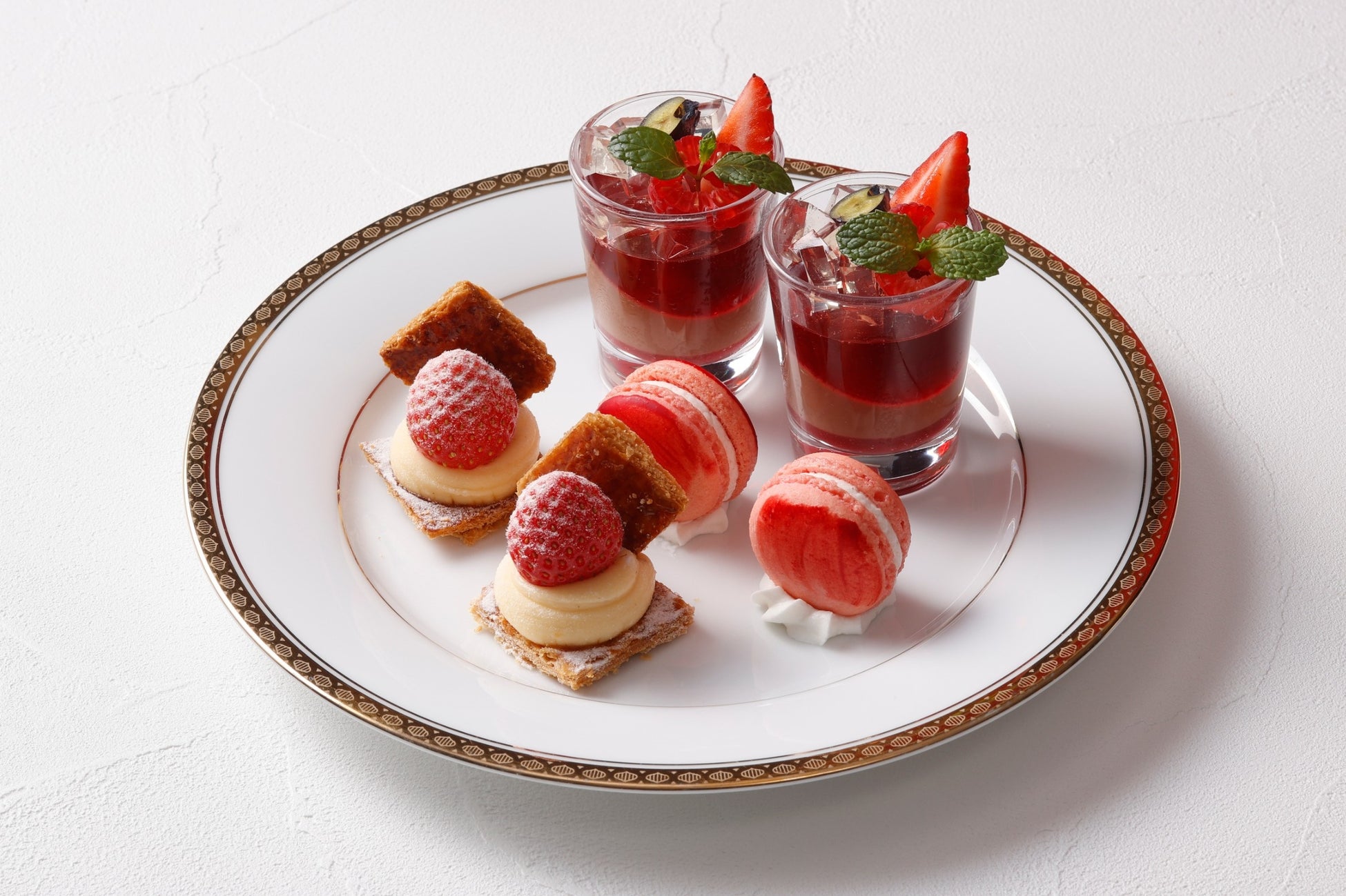 グラスに苺とラズベリーのジュレとチョコレートパンナコッタを重ねエルダーフラワーゼリーをトッピングしたヴェリーヌや、苺のバタークリームで仕上げたオペラのほか、ミルフィーユやマカロン、ガナッシュなど、バリエーション豊かな愛らしい苺スイーツがティースタンドを彩ります。セイボリーは、サワークリームと黒胡椒がアクセントの苺とラズベリーのバターサンドや、牛ほほ肉とブルーチーズを使用したキッシュ、苺とスモークサーモンの相性抜群なサラダと、個性豊かなメニューをご用意しました。甘い香りの苺の魅力をたっぷり詰め込んだ“苺尽くし”のアフタヌーンティーをぜひご堪能ください。