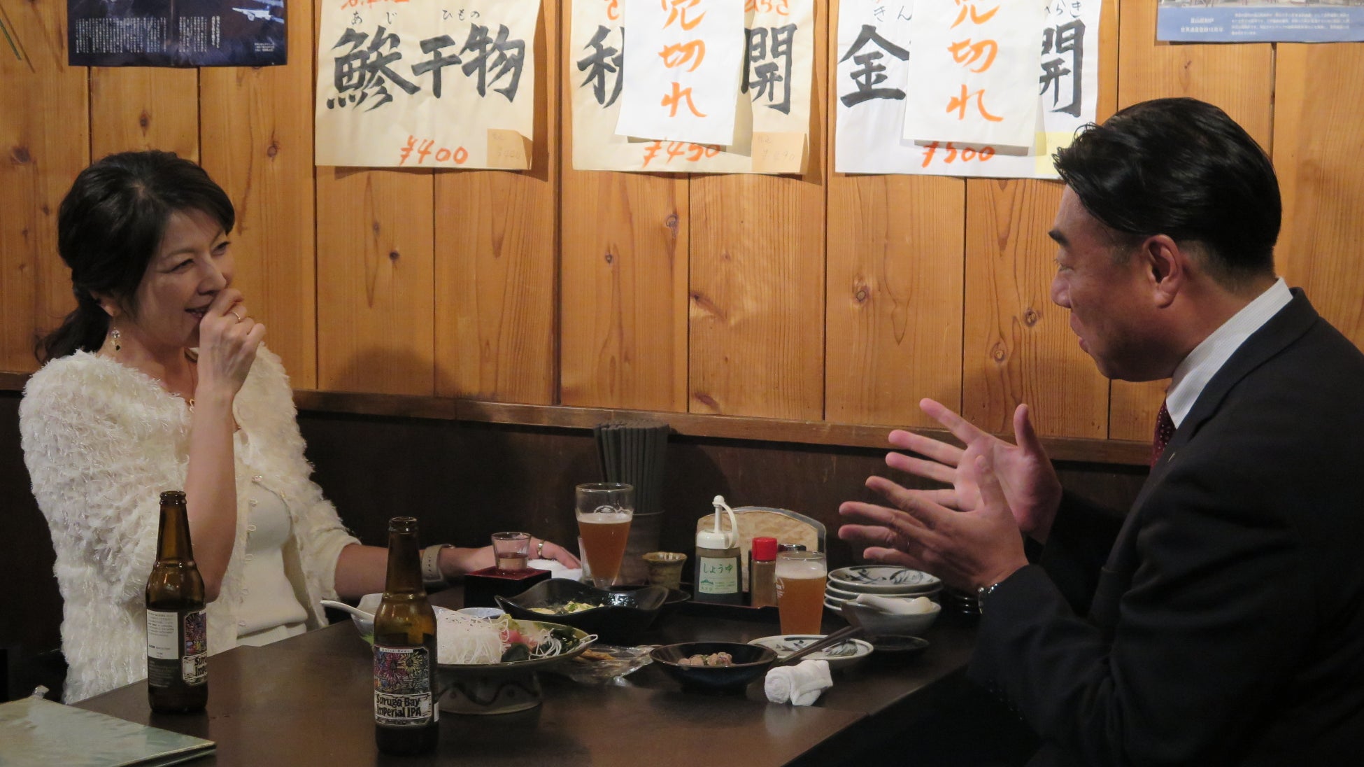 沼津まで足を運んでいただいた飯島さんに「沼津の魅力を伝えたい!」と、同番組として初となる首長=自治体の長である賴重(よりしげ)沼津市長が店を訪れ、飯島さんとお酒を酌み交わしました。