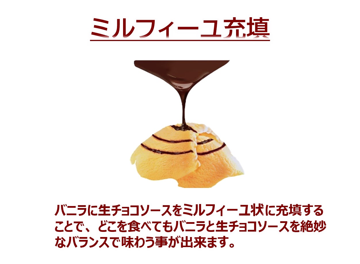 バニラに生チョコソースをミルフィーユ状に充填することで、どこを食べてもバニラと生チョコソースを絶妙なバランスで味わう事が出来ます。