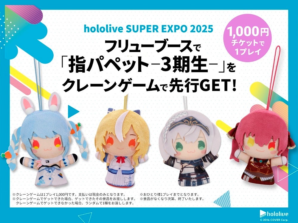 クレーンゲーム先行体験では、3月下旬から全国のアミューズメント施設にて展開する『指パペットー3期生ー』が登場。兎田ぺこらさん、不知火フレアさん、白銀ノエルさん、宝鐘マリンさんのプライズのうち、お好きなアイテムにチャレンジいただけます。1プレイ1,000円で体験可能で、アイテムをゲットできなかった場合はいずれか1つをランダムでプレゼントします。