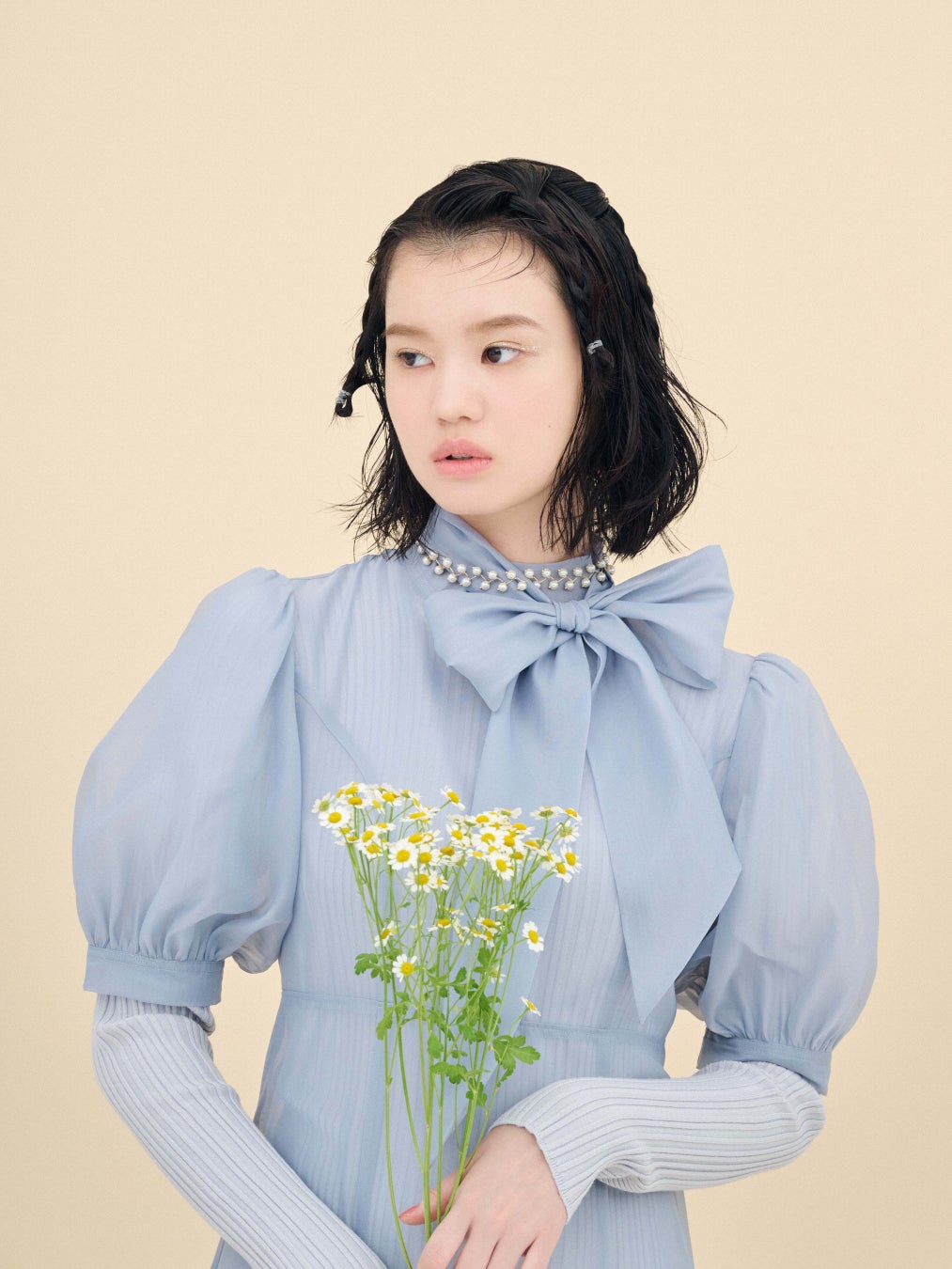 透明感のあるサックスブルーは、ニットとオーガンジーが絶妙な差異で洒落感のあるカラーリングに。