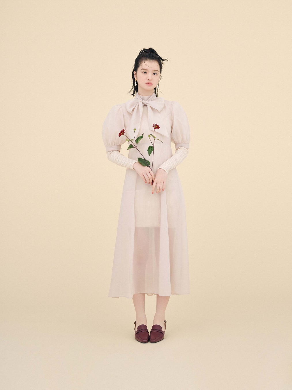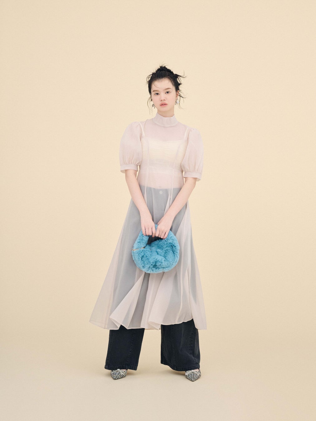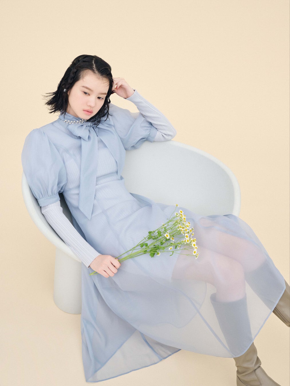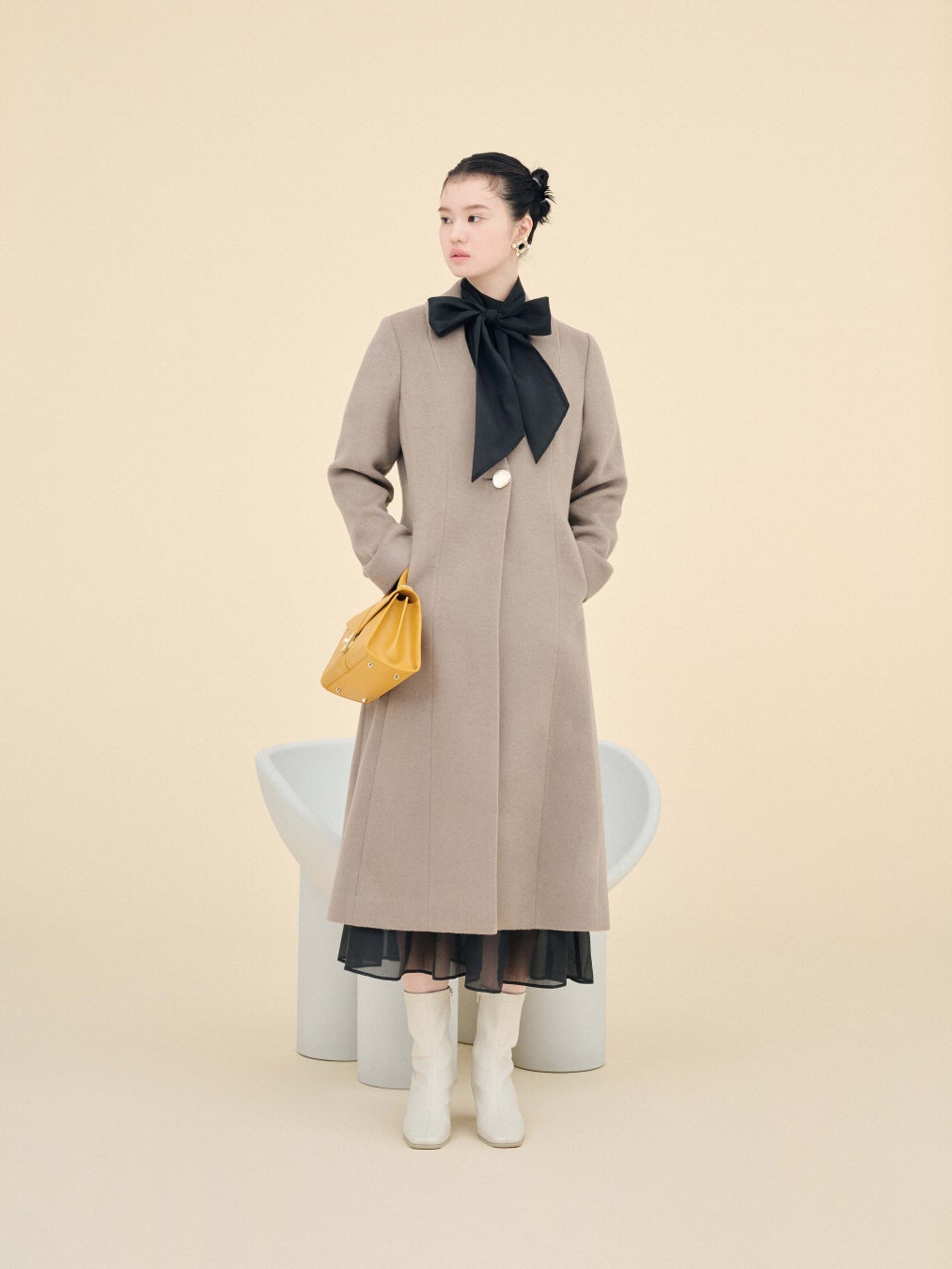 柔らかいアイボリーは、小物との相性抜群◎。