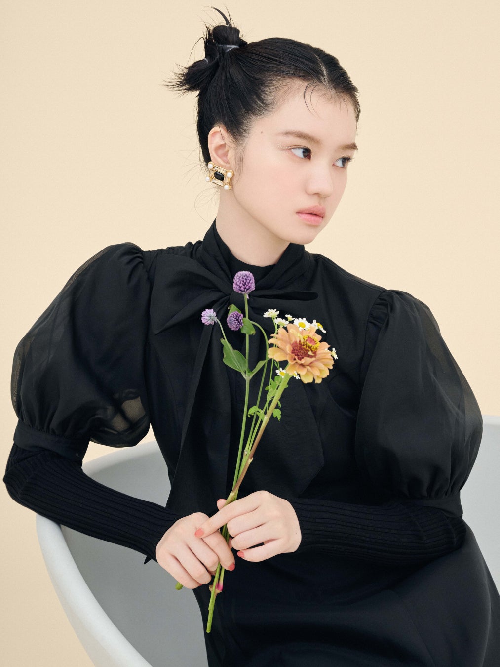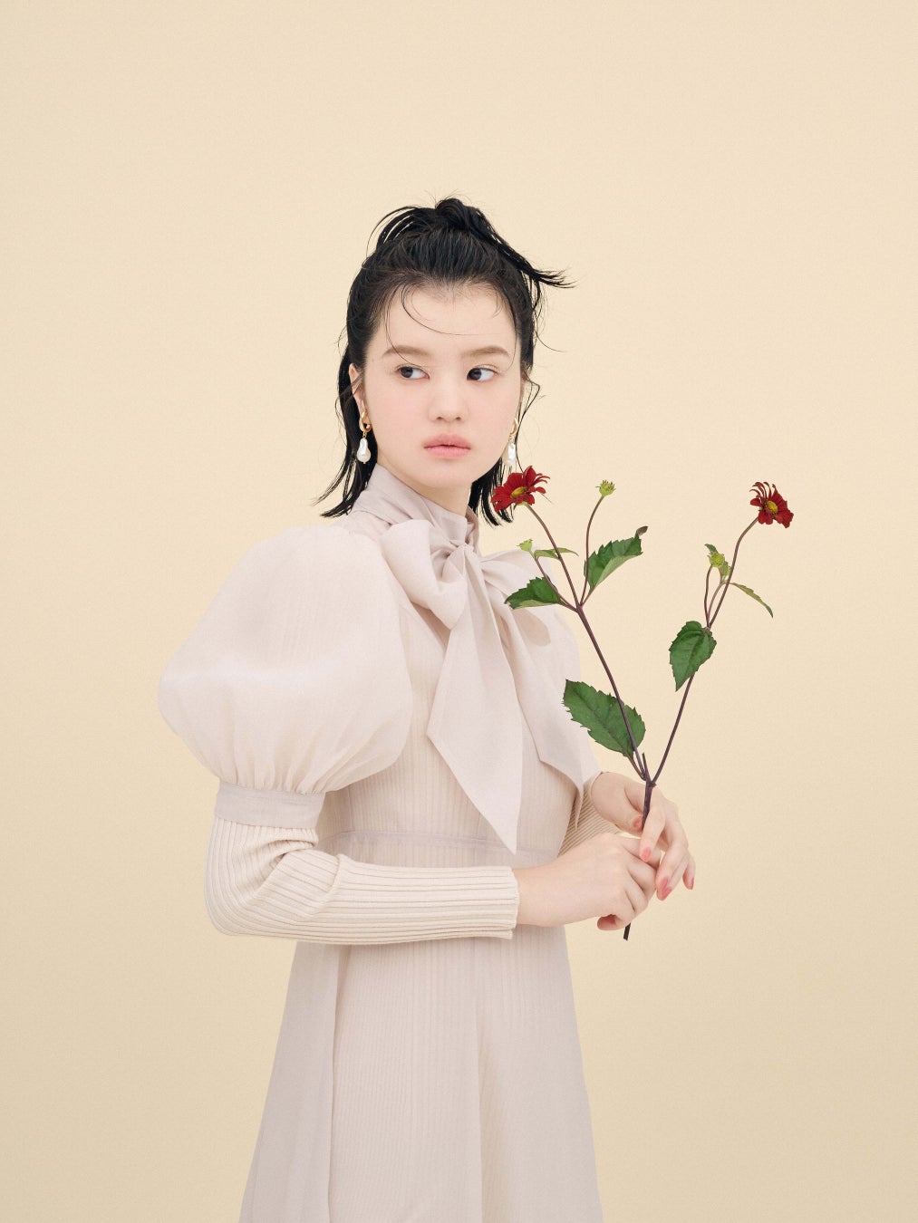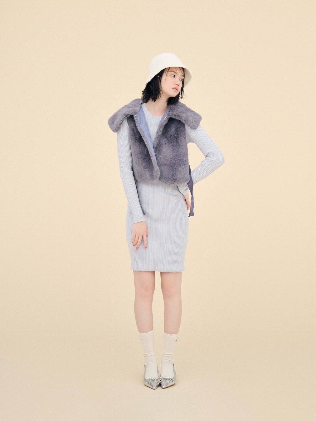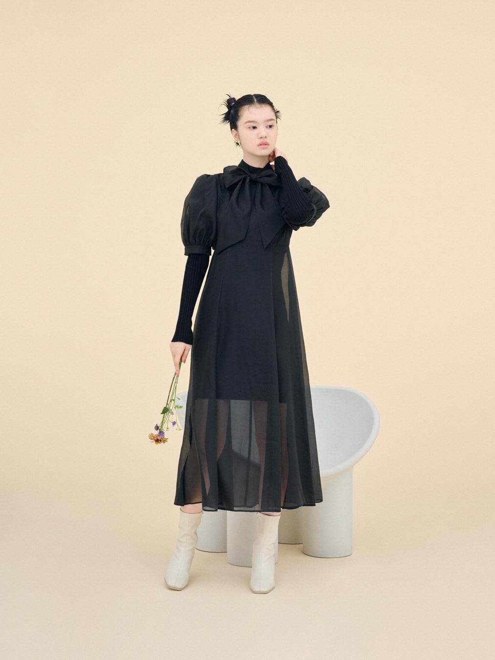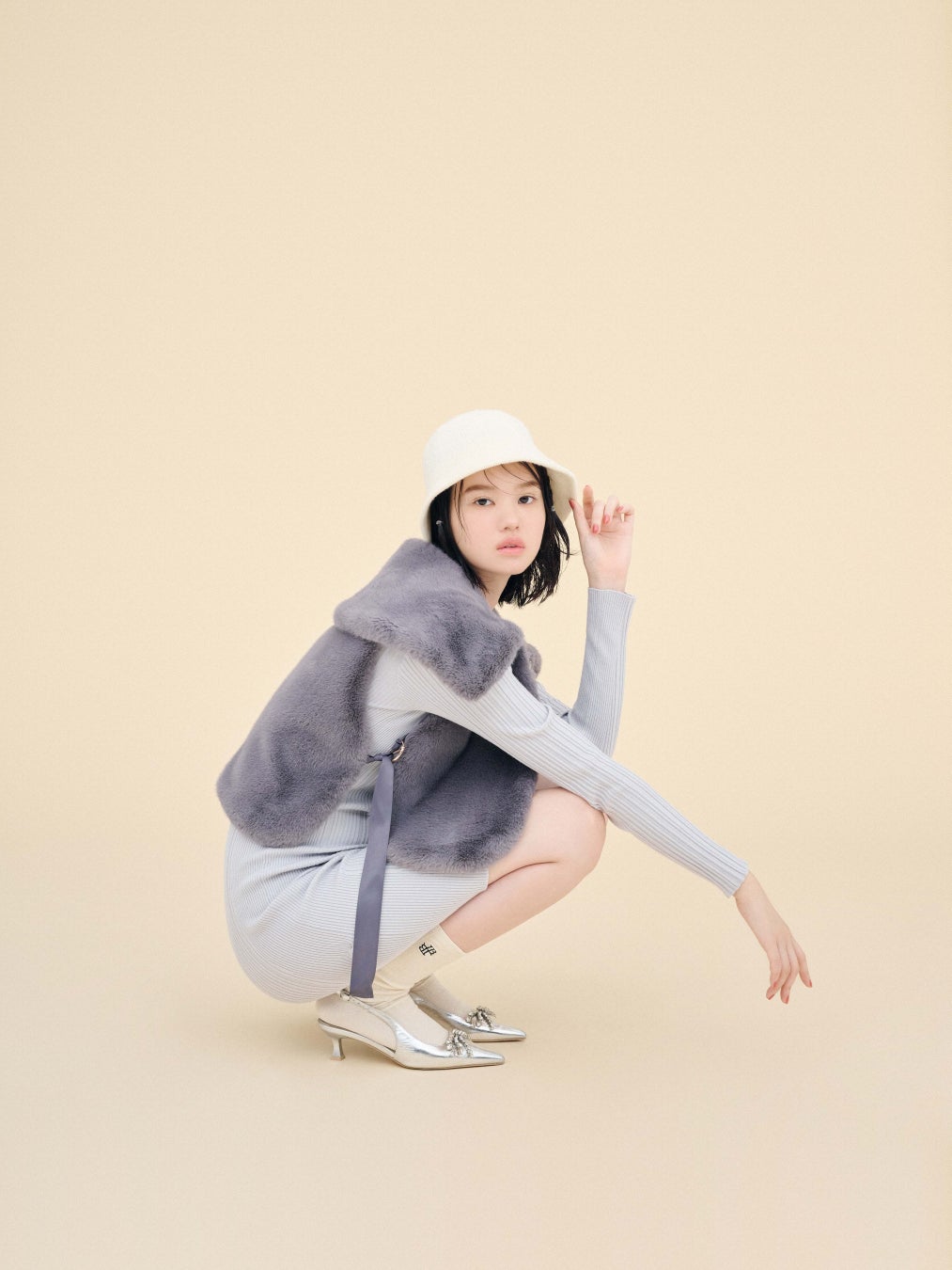 柔らかいアイボリーは、小物との相性抜群◎。