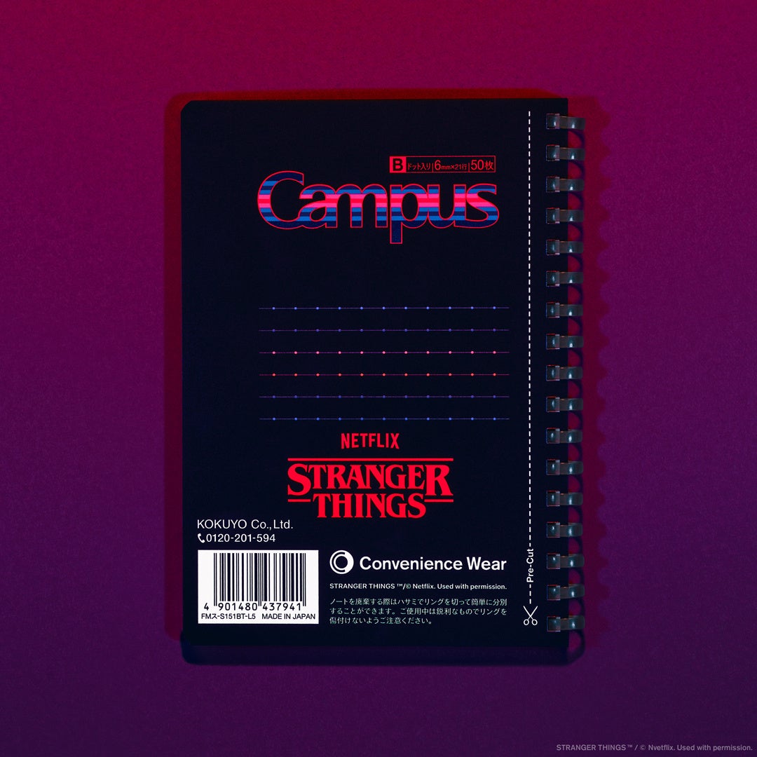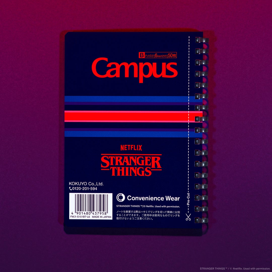 2025年12月26日(金)にシーズン5第5話〜第7話、2026年1月1日(木)に第8話(最終話)の配信を控え、いよいよ最終シーズンを迎えるにあたり、以前ご好評をいただいた「ラインソックス」「タオルハンカチ」などのアパレルアイテムに加えて、コクヨと共同開発の「コンビニエンスウェア」文具シリーズより機能性で話題の「メッシュポーチ」「リングノート」をストレンジャー・シングスカラーでデザインし、「コンビニエンスウェア」コラボレーション史上最大のラインアップで展開いたします。