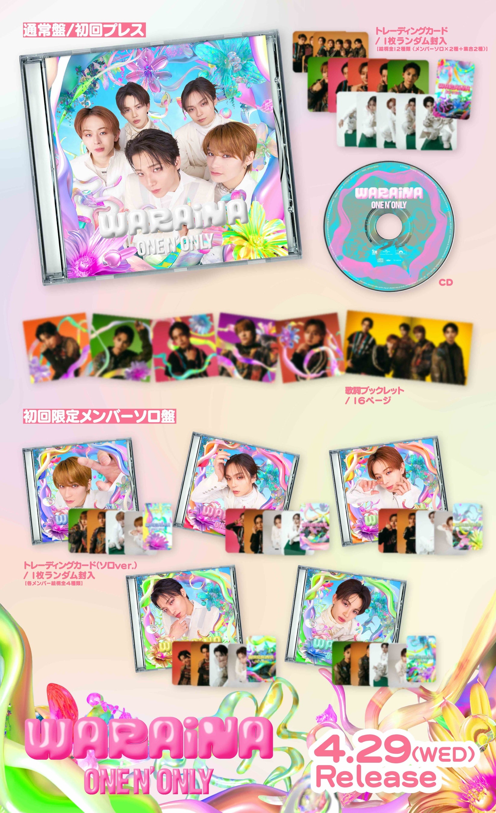 今作は初回限定盤A・初回限定盤B・通常盤・メンバーソロ盤(5種)の全8形態でリリースされ、全3曲を収録しています。表題曲「WARAiNA」は突き抜けた多幸感と華やかなパレード感が満載で、ONE N’ ONLYが向かう未来の明るさを表すようなポジティブなエネルギーに溢れた楽曲となっています。「Samba de Night Fever」はノリと色気、タイトル通りサンバのリズムが盛り込まれた陽気なお祭りソング。「Beast Mode」はONE N’ ONLYの真骨頂であるダークで強烈なトラックと攻撃的なラップパートでライブパフォーマンスへの期待度が上がる楽曲に仕上がりました。