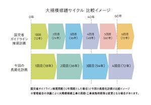マンションの安全性・快適性をより長く維持するために、長期修繕計画を策定していますが、約12年周期の一般的な大規模修繕を基本としながら、屋上防水やシーリングなどの一部を高耐久仕様とすることで、18年周期の大規模修繕サイクル(※2)を実現しました。修繕周期を長期化することで廃棄物の削減だけでなく、修繕費用の削減にも貢献します。