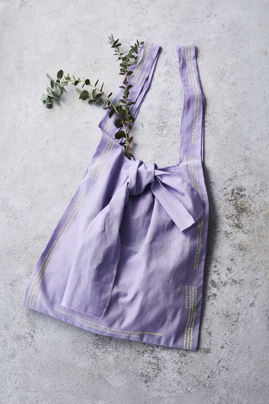 ラベンダーカラーの軽やかな布地に、BOUL’ANGEのメッセージが繊細にプリントされたエコバッグは、パンを包むようにやさしく日常を彩る一品。くるっと結べば、気分までふわりと華やぐデザインです。