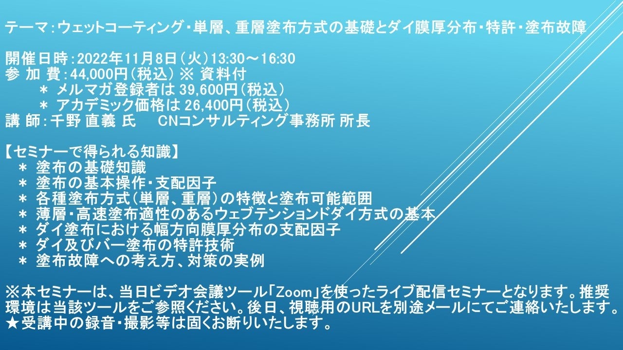 先端技術情報や市場情報を提供している(株)シーエムシー・リサーチ(千代田区神田錦町: https://cmcre.com/ )では、 各種材料・化学品などの市場動向・技術動向のセミナーや書籍発行を行っておりますが、 このたび「ウェットコーティング・単層、重層塗布方式の基礎とダイ膜厚分布・特許・塗布故障」と題するセミナーを、 講師に千野 直義 氏 CNコンサルティング事務所 所長)をお迎えし、2022年11月8日(火)13:30より、 ZOOMを利用したライブ配信で開催いたします。 受講料は、 一般:44,000円(税込)、 弊社メルマガ会員:39,600円(税込)、 アカデミック価格は26,400円(税込)となっております(資料付)。