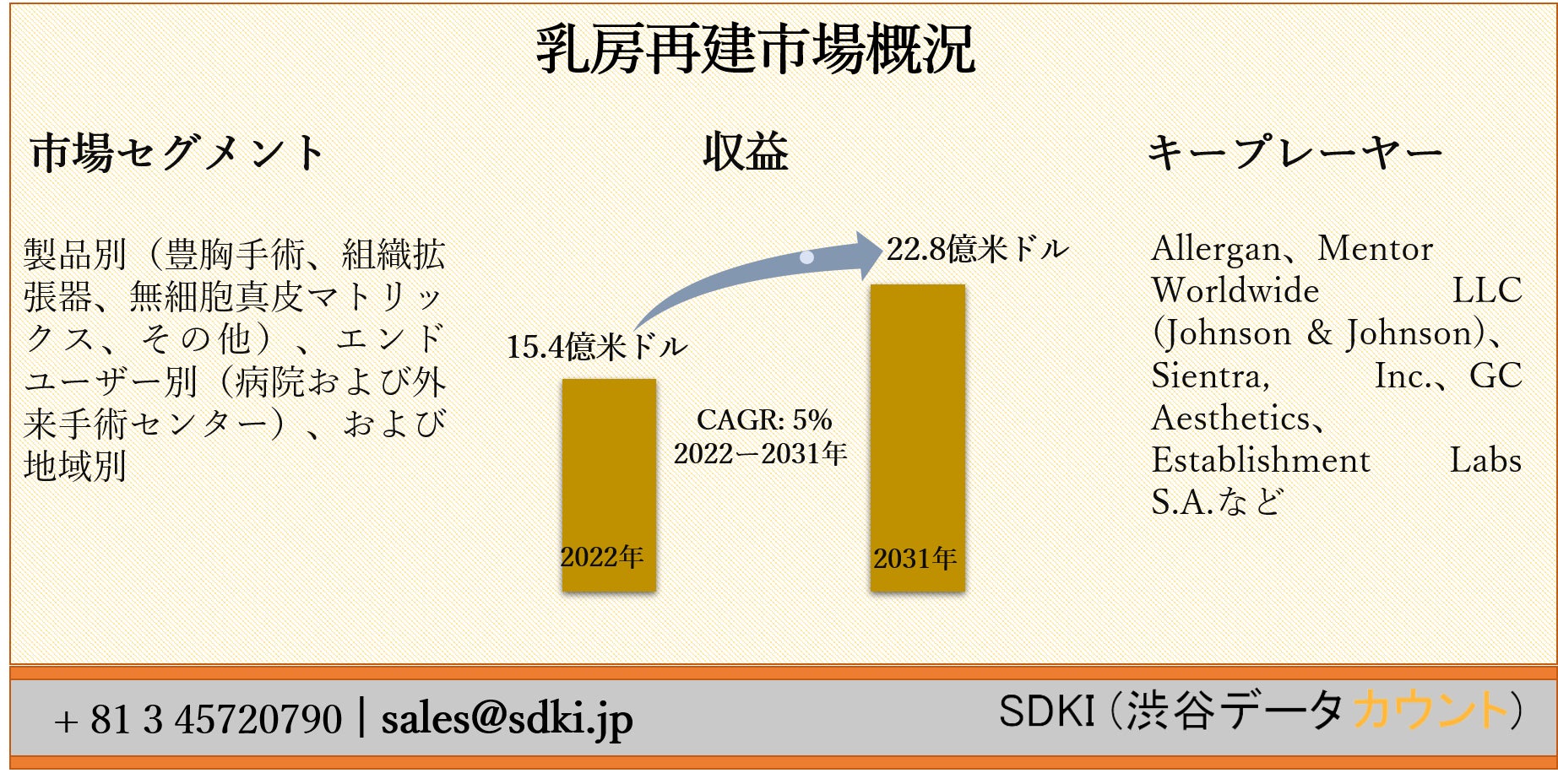 SDKI Inc.は、「乳房再建市場ー世界の予測2022ー2031年」新レポートを 2022年03月11日に発刊しました。この調査には、乳房再建市場の成長に必要な統計的および分析的アプローチが含まれています。レポートで提供される主要な産業の洞察は、市場の既存のシナリオに関する読者に市場の概要についてのより良いアイデアを提供します。さらに、レポートには、市場の成長に関連する現在および将来の市場動向に関する詳細な議論が含まれています。