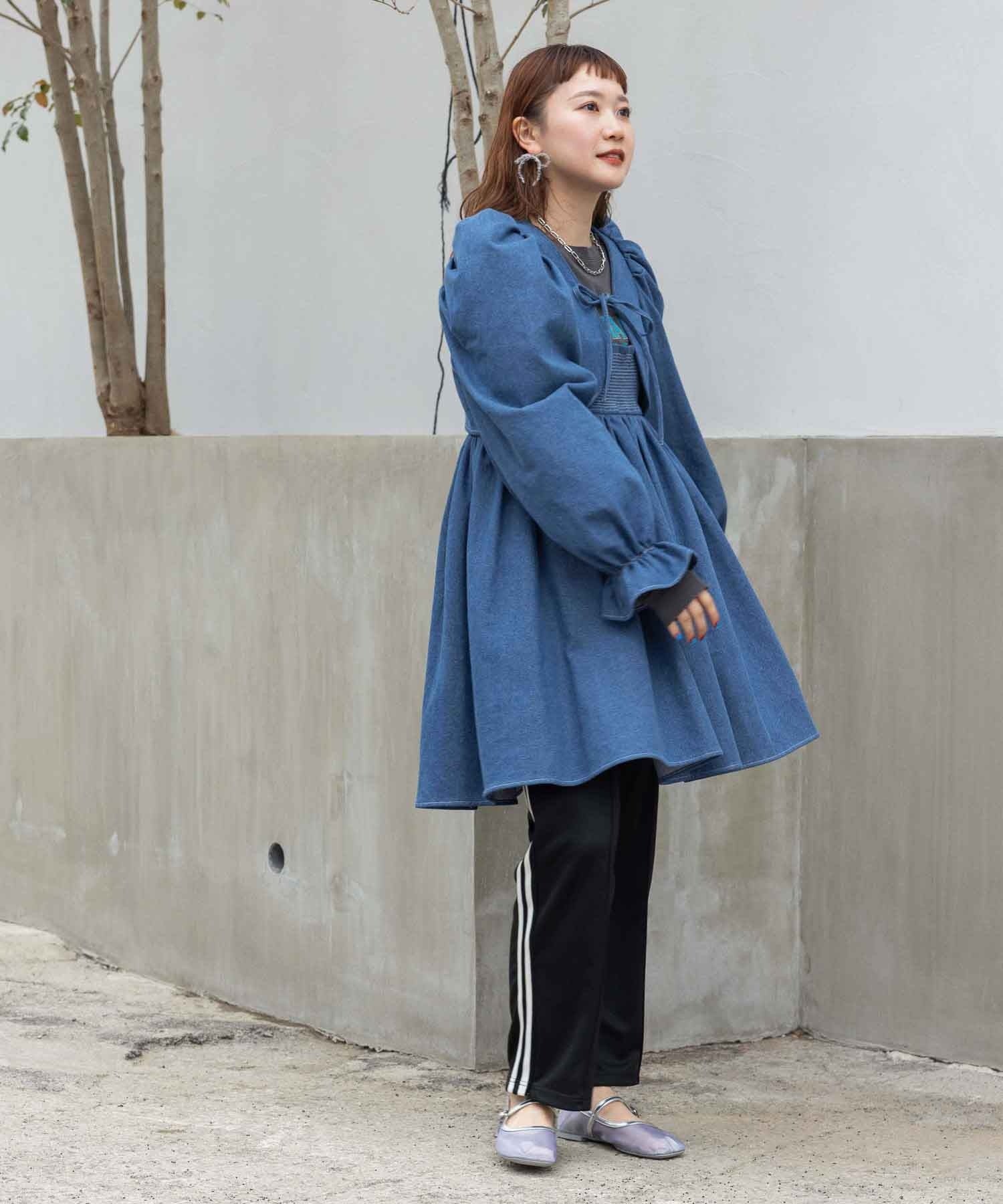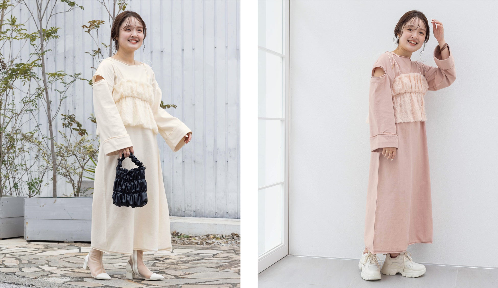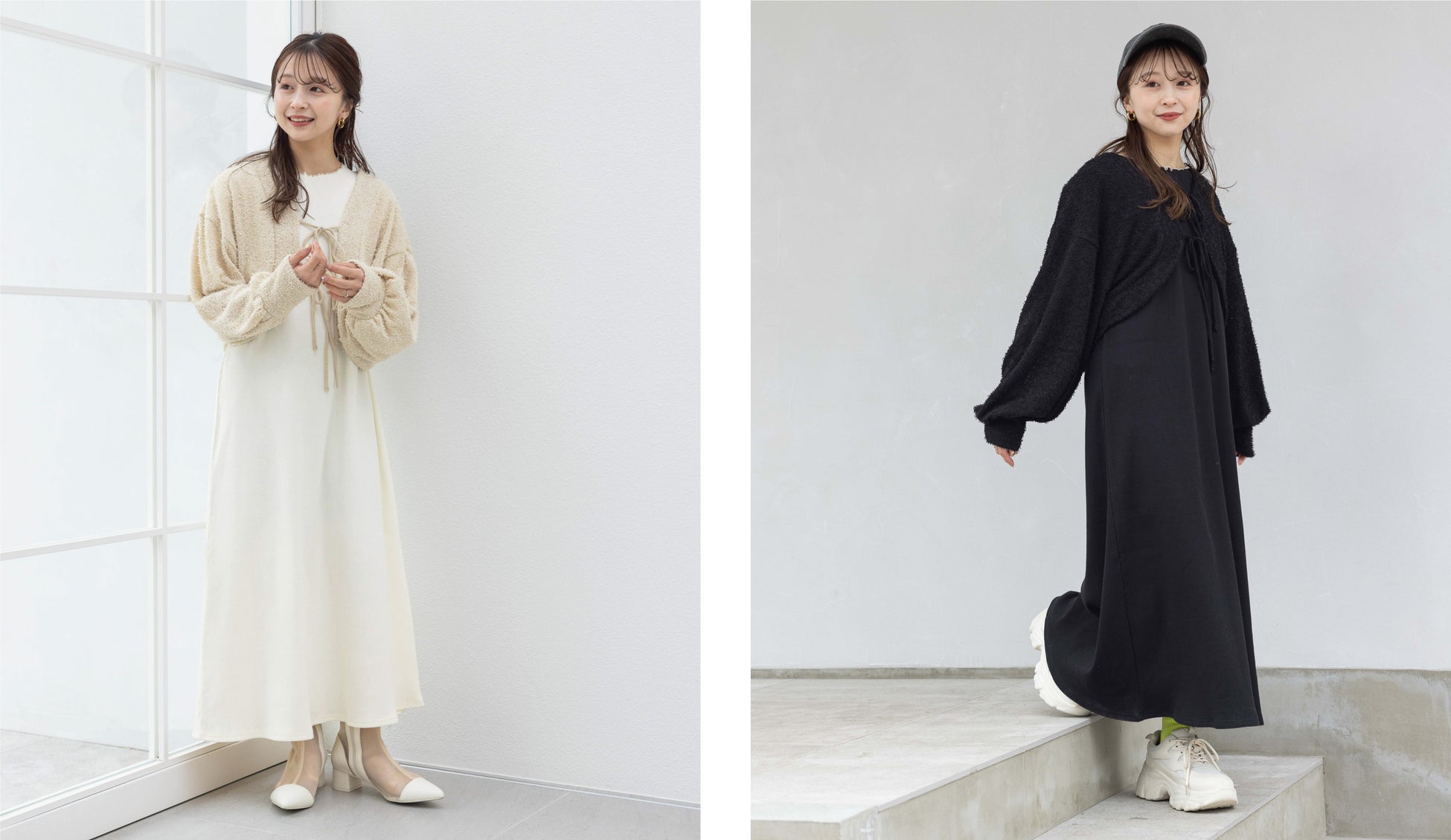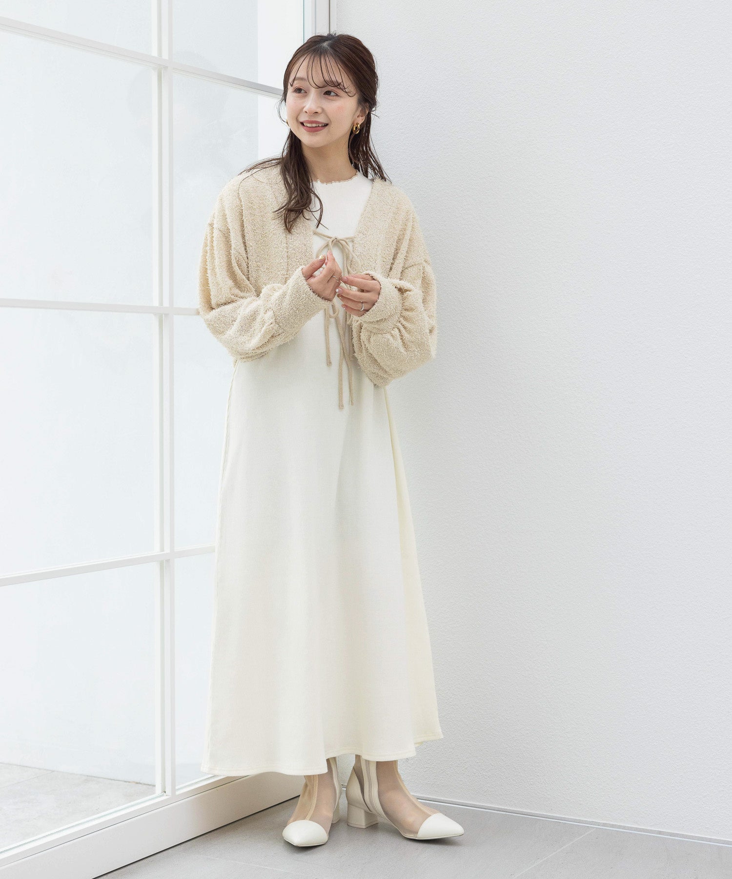カーディガンのふわふわとした素材感がお気に入りで、少しボリューム感を持たせることで女性らしいやわらかいシルエットになるようデザインしました。トレンドのワイドデニムと合わせて、甘辛ミックスのスタイリングもおすすめです。ワンピース単体でも綺麗に着用できるようにシルエットにもこだわりました。