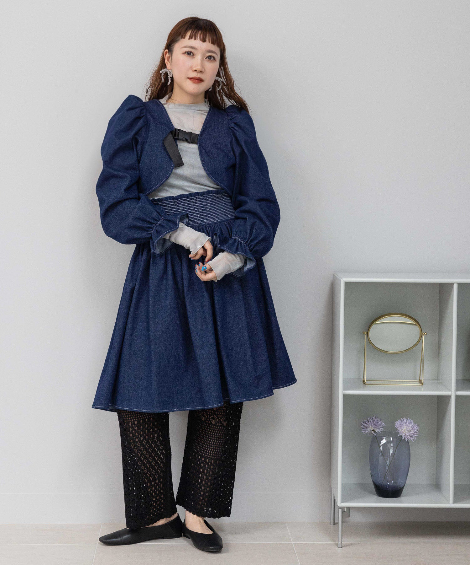 パフスリーブのボレロとミニワンピースのセットで、どちらも単体で着回しができるようにデザインしました。ボレロは着やせするシルエットにこだわり、前後2WAYのデザインなので雰囲気の変化も楽しめます。ワンピースはスカートとしても着用できます。