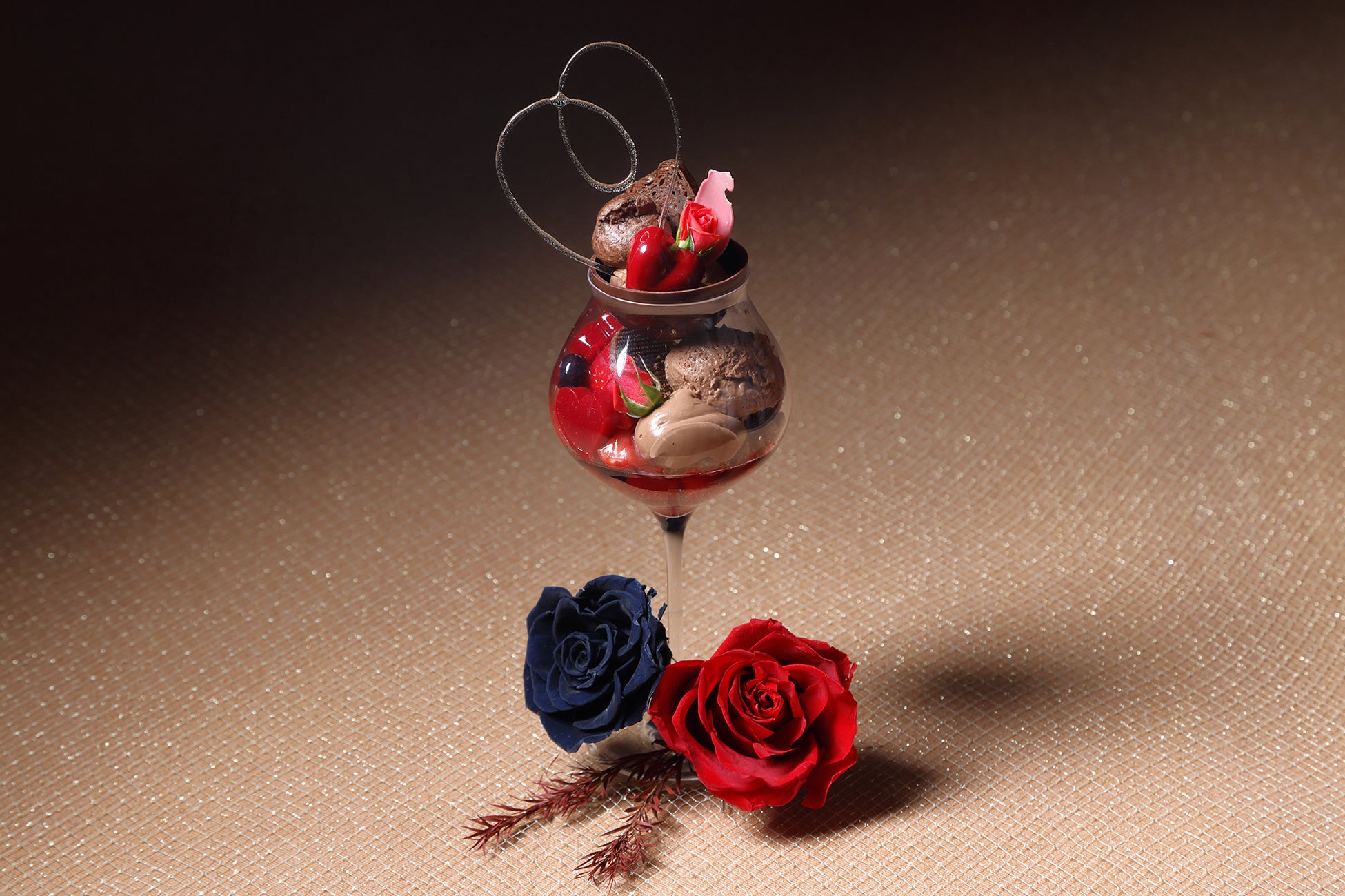 ノンアルコールスパークリングジュレとハート形のラズベリージュレに、チョコレートのクリームやアイスクリーム、フレッシュいちごを重ねました。トップには、カヌレやボンボンショコラを忍ばせたチョコレートのカップを飾り、ハートの飴細工で仕上げた、バレンタインシーズン限定の心ときめく一品です。