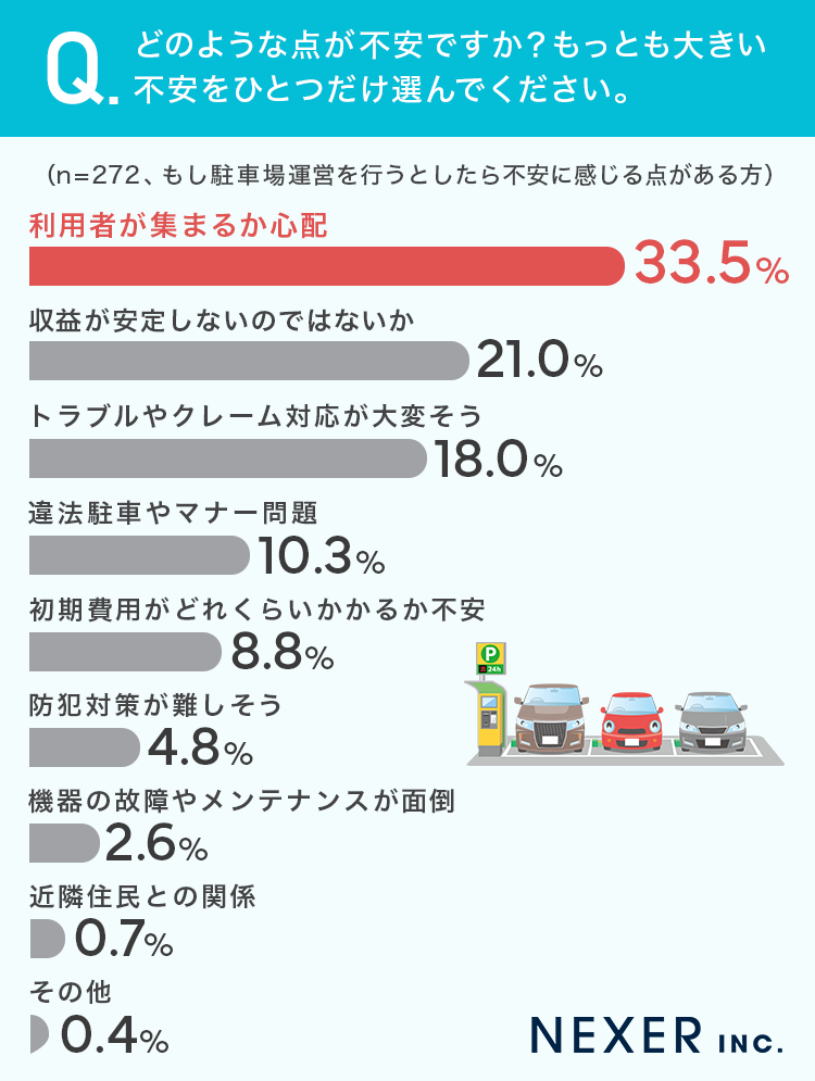 33.5%が「利用者が集まるか心配」、21.0%が「収益が安定しないのではないか」と回答しており、駐車場運営を行う上で安定して収益を得られるかが不安だという方が多くいました。