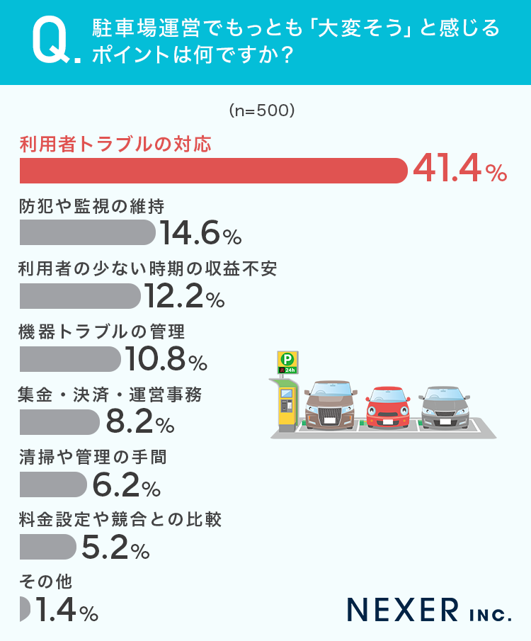 一方で、駐車場運営でもっとも「大変そう」と感じるポイントは4割以上が「利用者トラブルの対応」を挙げています。