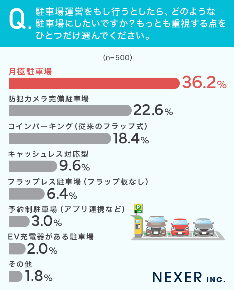 36.2%が「月極駐車場」、22.6%が「防犯カメラ完備駐車場」、18.4%が「コインパーキング(従来のフラップ式)」と回答しました。