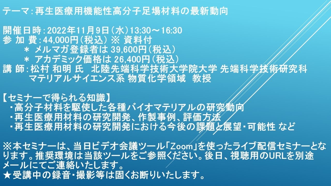 先端技術情報や市場情報を提供している(株)シーエムシー・リサーチ(千代田区神田錦町: https://cmcre.com/ )では、 各種材料・化学品などの市場動向・技術動向のセミナーや書籍発行を行っておりますが、 このたび「再生医療用機能性高分子足場材料の最新動向」と題するセミナーを、 講師に松村 和明 氏 北陸先端科学技術大学院大学 先端科学技術研究科 マテリアルサイエンス系 物質化学領域 教授)をお迎えし、2022年11月9日(水)13:30より、 ZOOMを利用したライブ配信で開催いたします。 受講料は、 一般:44,000円(税込)、 弊社メルマガ会員:39,600円(税込)、 アカデミック価格は26,400円(税込)となっております(資料付)。