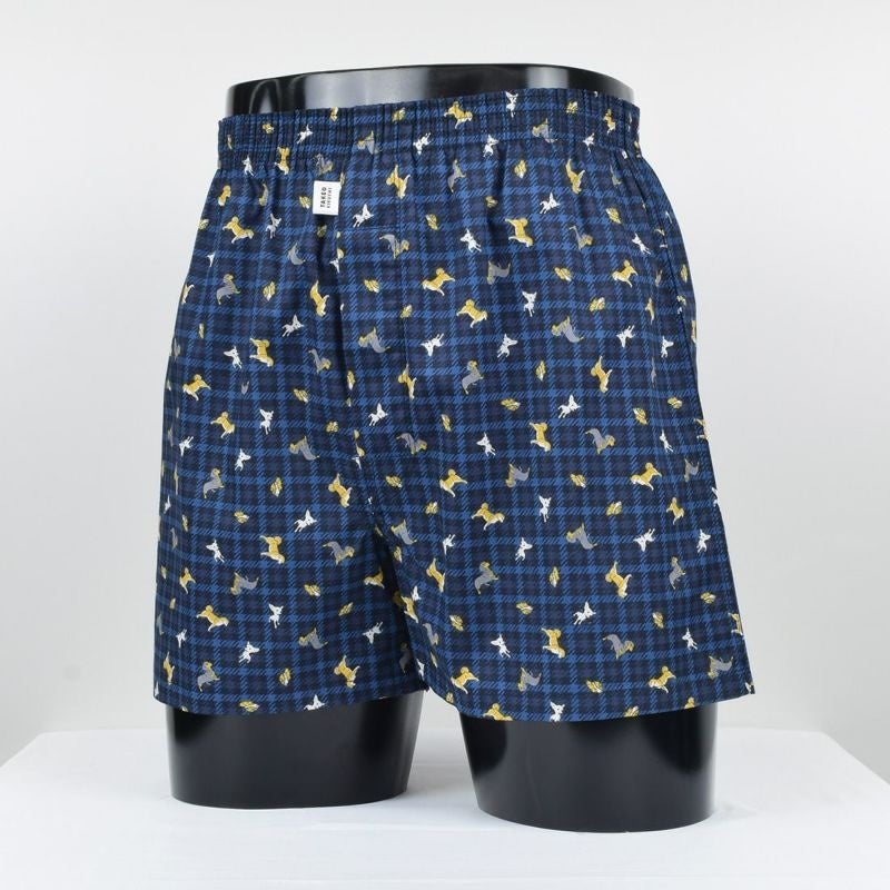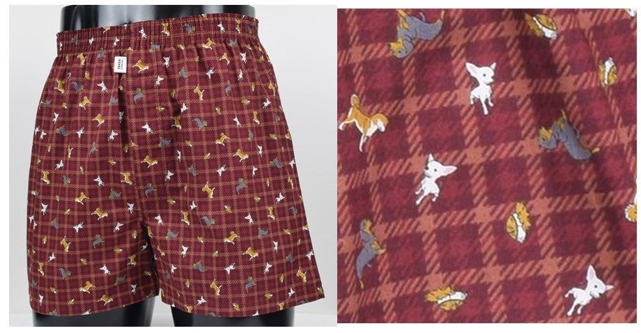 ヒップ側のパーツを左右、中央と3枚に接ぐ事により座った時や屈んだ時の可動域を確保しつつもたつき感をなくしスッキリと見えるパターンを採用。若干打ち込み本数を少なくする事で肌触りの良さに拘りました。千鳥チェックベースの上に様々なDOGを配置する事で大人の中に垣間見える愛らしさを表現。
