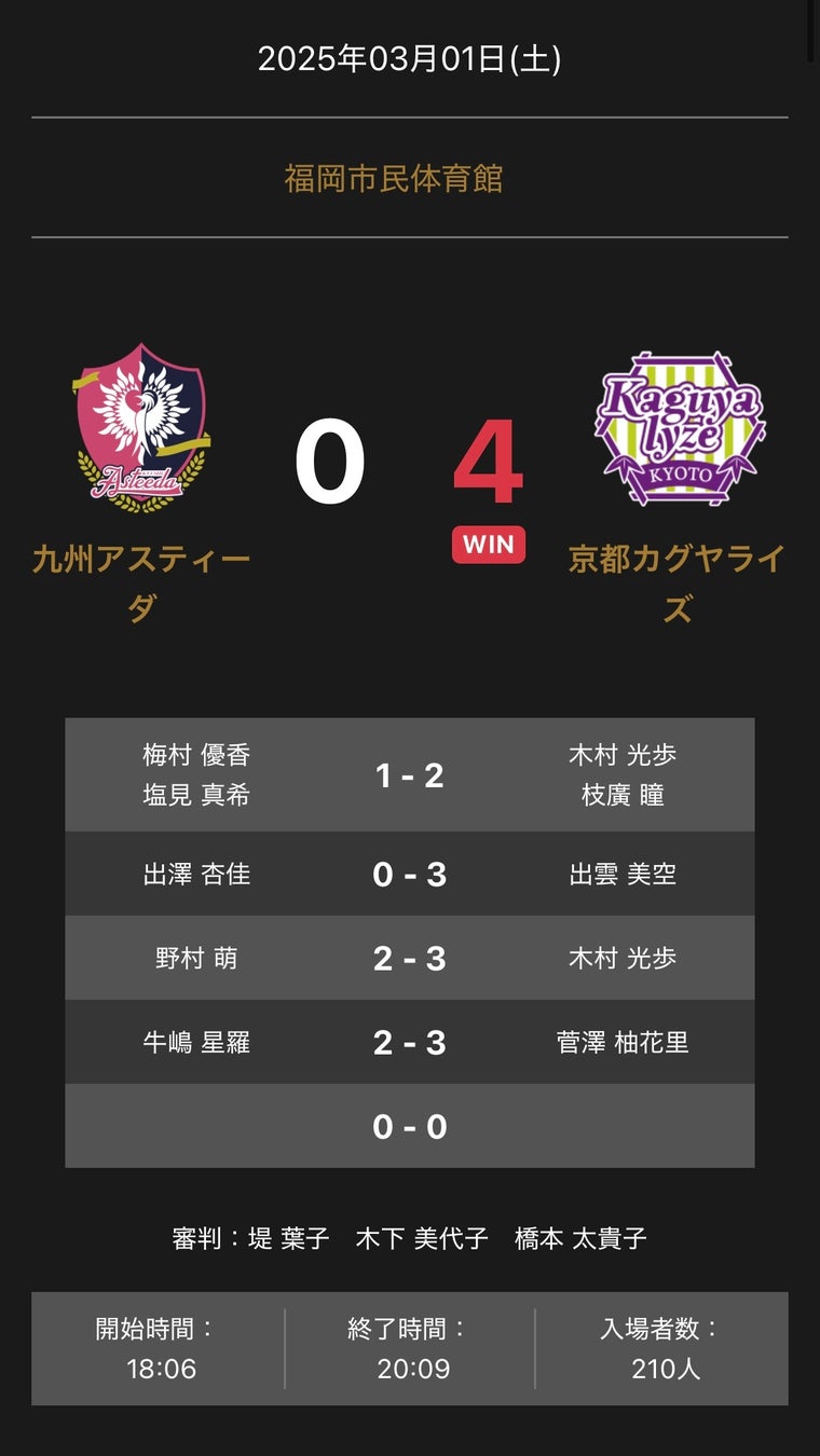 ノジマTリーグ 2024-2025シーズン 公式戦 3月1日開催 「九州アスティーダ vs 京都カグヤライズ」の試合は、4-0で京都カグヤライズが勝利しました。