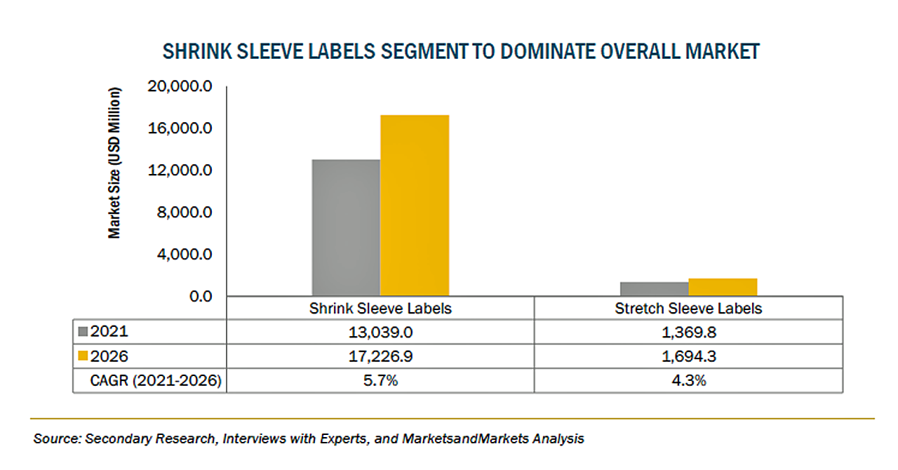 ストレッチスリーブラベルおよびシュリンクスリーブラベルの市場規模は、2021年の144億米ドルからCAGR5.6%で成長し、2026年には189億米ドルに達すると予測されています。同市場の成長の主な要因は、人口の増加、経済発展とGDPの増加、意識の高まり、タンパーエビデント(改ざん防止)ラベルの需要の増加などが挙げられます。また、食品・飲料業界からの継続的な需要もあり、今後の同市場の需要を促進すると予測されます。