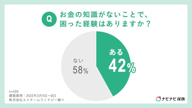 実際に、2022年2月4日~8日にエイチームフィナジーで実施した調査(https://www.a-tm.co.jp/news/27870/)によると、現在成人している約42%の方が、お金の知識がないことで困った経験があると回答しています。