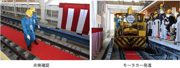 式典では、関係者11名がレールとまくらぎを締結装置で固定するレール締結を行ったのち、軌道モータカーを走行して、レール敷設工事をはじめ、これまでの工事の完成を関係者の皆様でお祝いしました。