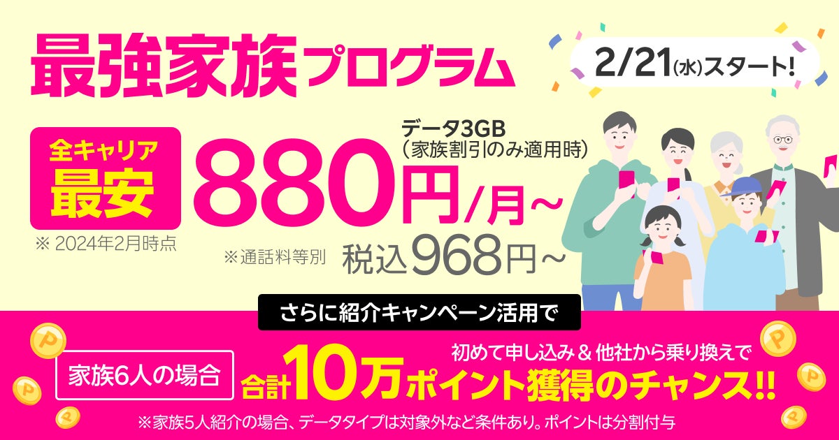 - 複雑な条件なしの家族割引適用で全キャリア最安月額880円からずっと利用可能 –