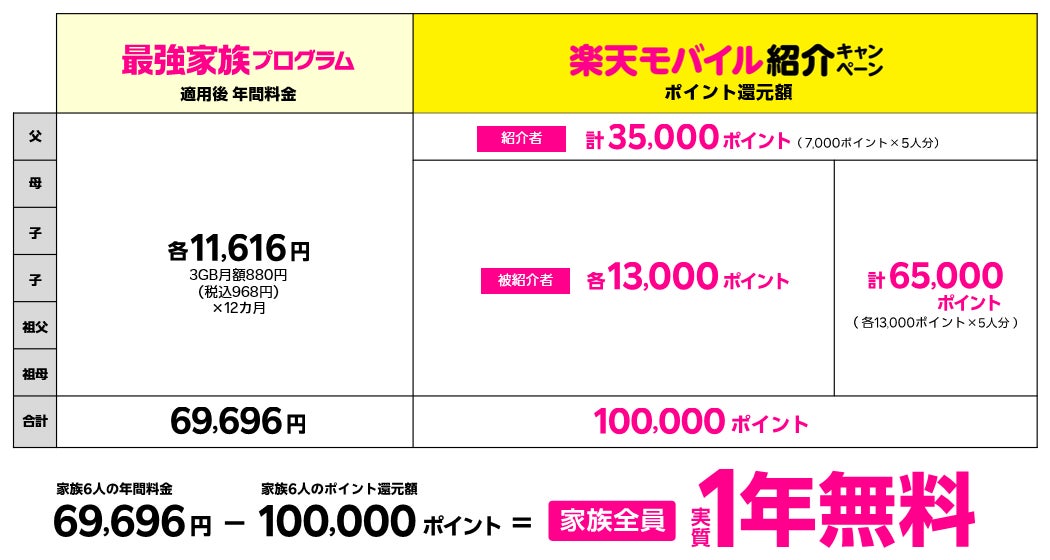 ■ご家族6人で「最強家族プログラム」と「【楽天モバイル】Rakuten最強プラン紹介」キャンペーンを利用した場合