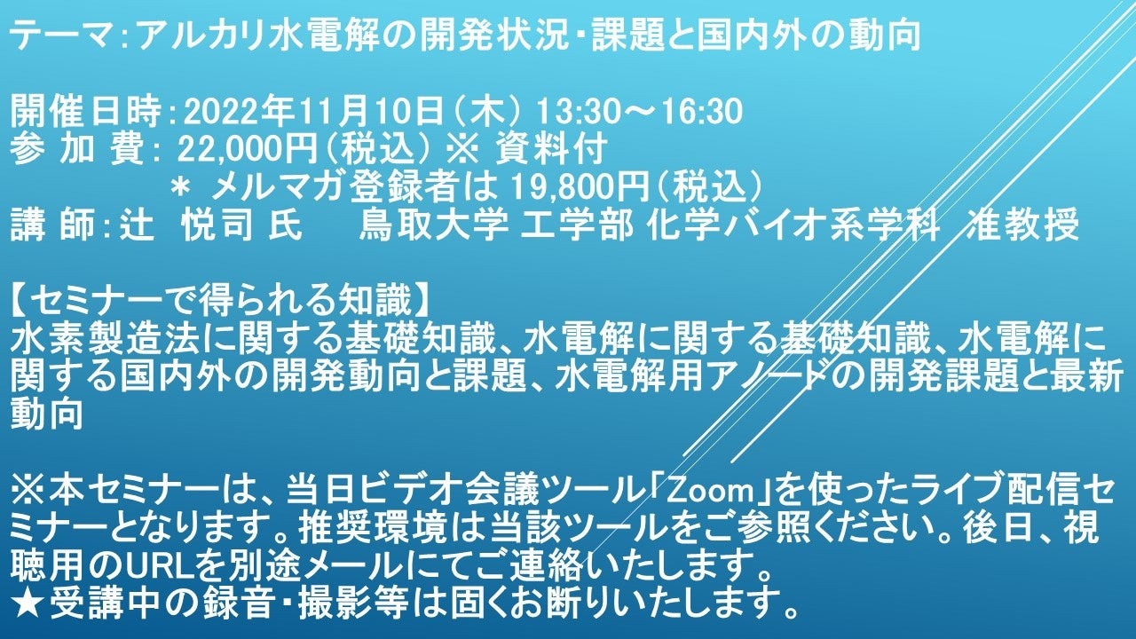 先端技術情報や市場情報を提供している(株)シーエムシー・リサーチ(千代田区神田錦町: https://cmcre.com/ )では、 各種材料・化学品などの市場動向・技術動向のセミナーや書籍発行を行っておりますが、 このたび「アルカリ水電解の開発状況・課題と国内外の動向」と題するセミナーを、 講師に辻 悦司 氏 鳥取大学 工学部 化学バイオ系学科 准教授)をお迎えし、2022年11月10日(木)13:30より、 ZOOMを利用したライブ配信で開催いたします。 受講料は、 一般:22,000円(税込)、 弊社メルマガ会員:19,800円(税込)となっております(資料付)。