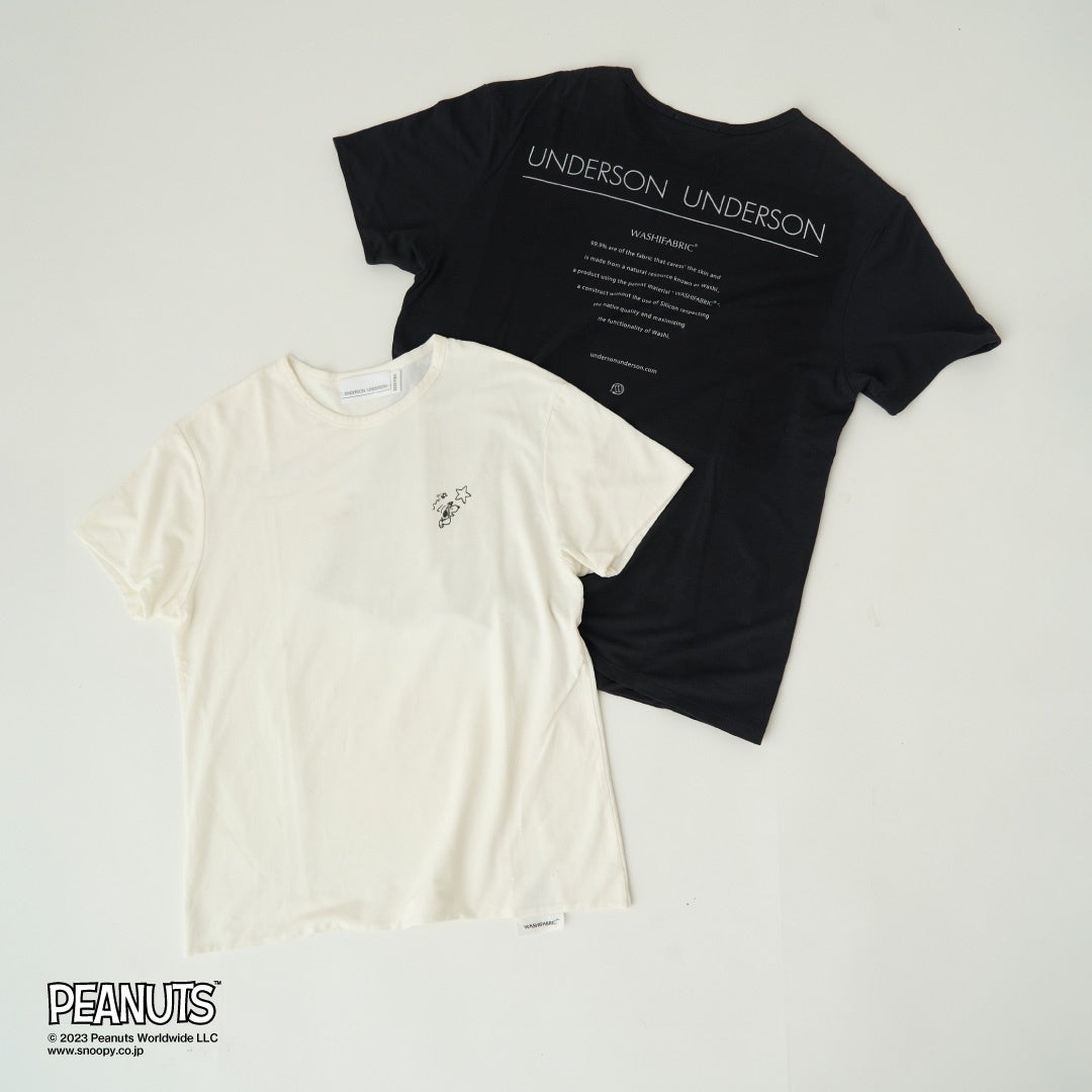 フロントにあしらったスヌーピーとウッドストックのプリントと、ロゴのバックプリントがポイントのTシャツシリーズ。UNDERSON UNDERSONのシグネチャーである和紙素材“WASHIFABRIC®”を使用しています。