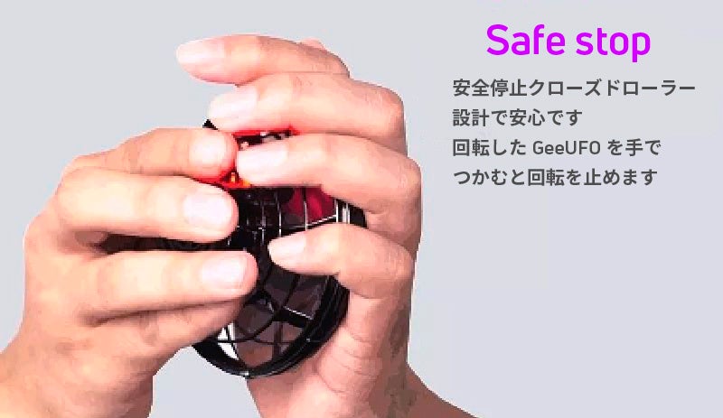 回転したGeeUFOを握ると、本体が回転を止める安心停止クローズドローラー設計です。柔軟で強固なボディで、長く安心して遊ぶことができます。
