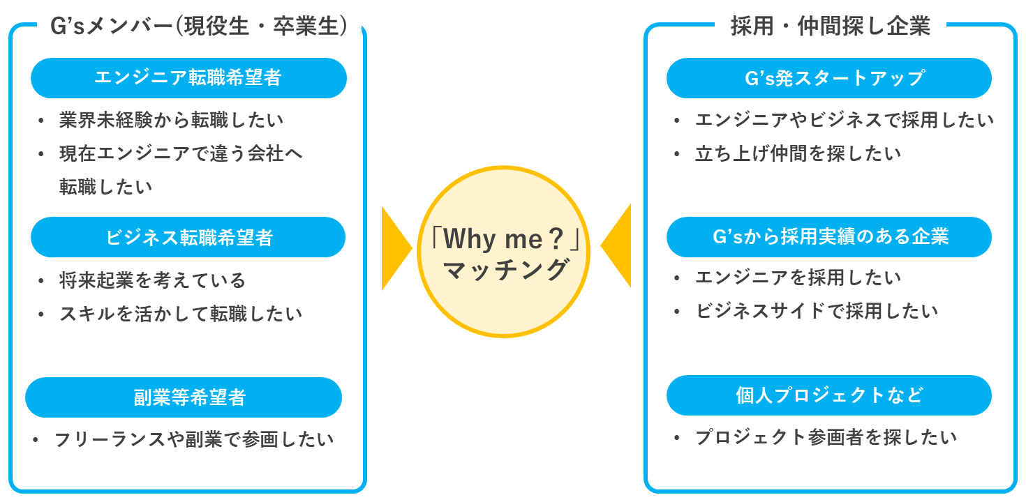 『G’s CROSS POINT』は、採用や仲間探し、G’sメンバーは就転職・副業など、ビジョンに共感した上で能力を発揮できる仕事・プロジェクトに出会う場です。