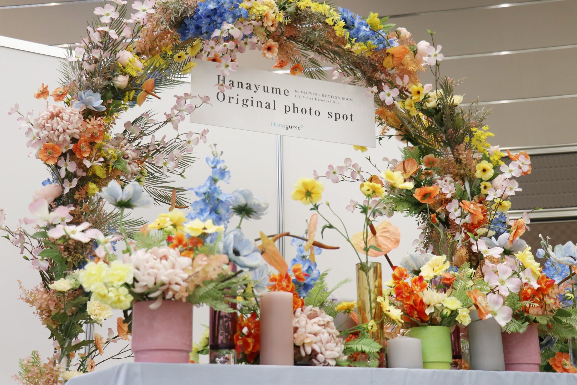 ハナユメフェスタ関西にてお披露目したオリジナルフォトブースでは、多くのお客様がイベント来場の思い出に撮影されていました。オリジナルフォトブースを手掛けたのは、多くのウエディングフラワーをデザインする日比谷花壇のトップ・フローリスト伊藤裕之さんです。