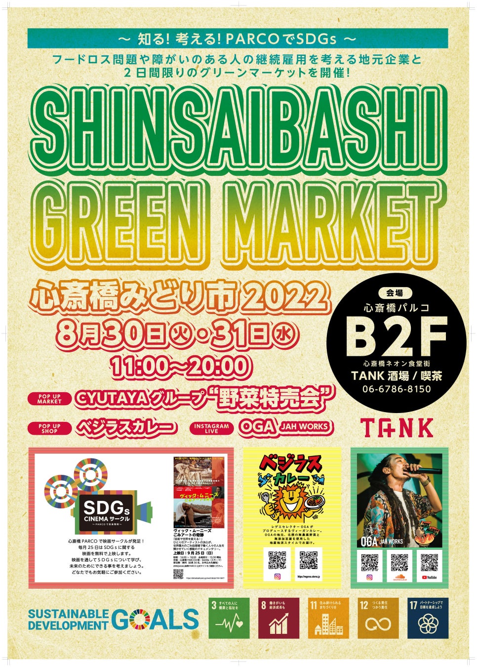 フードロス問題や障がいのある人の継続雇用を考える地元企業が2 日間限りのグリーンマーケットを開催!SHINSAIBASHI GREEN MARKET 8 月30 日・31 日開催!