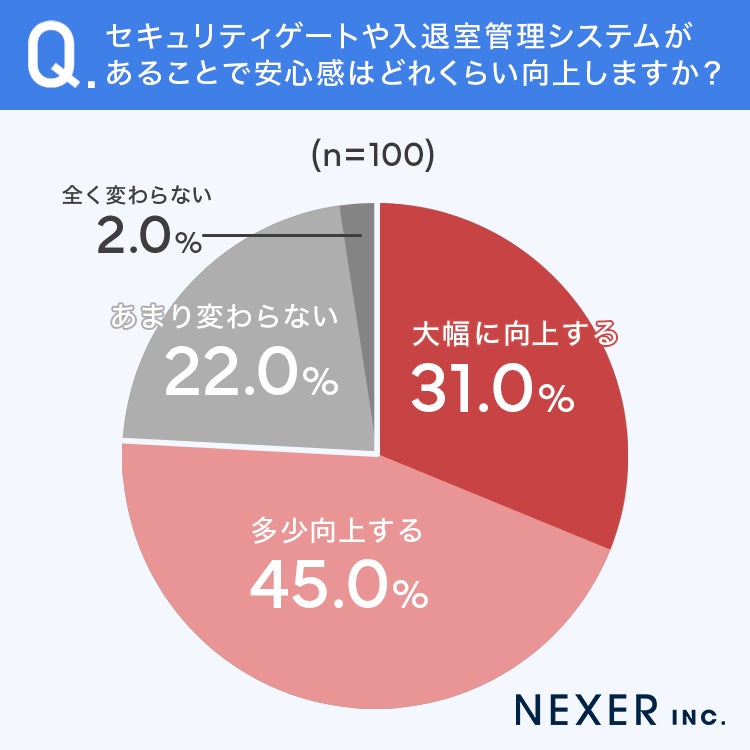 31%が「大幅に向上する」、45%が「多少向上する」と回答し、合計76%の方がセキュリティゲートや入退室管理システムがあることで安心感が向上すると回答しています。