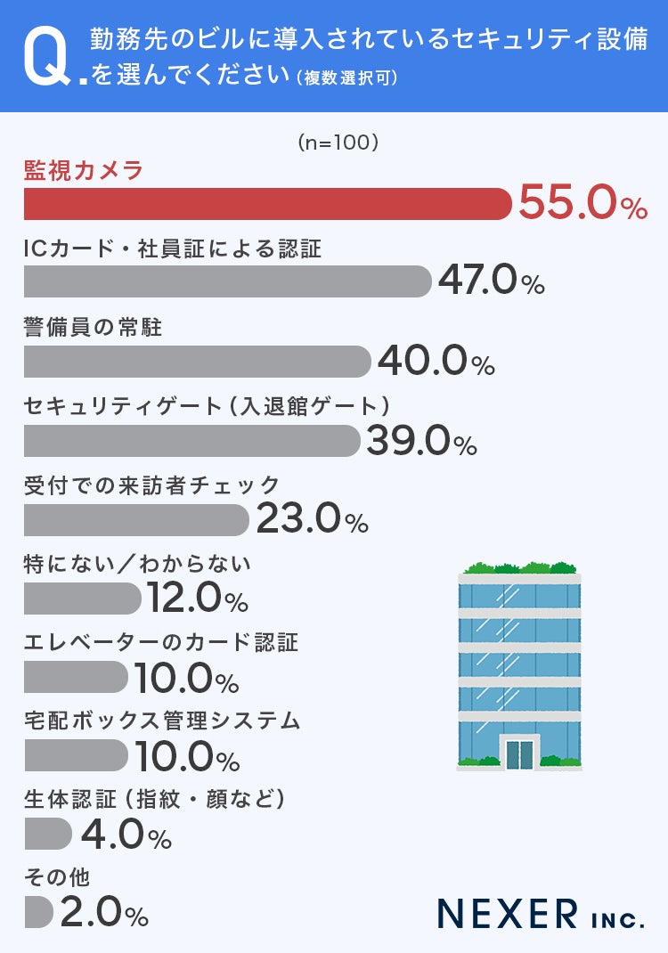 55%が「監視カメラ」、47%が「ICカード・社員証による認証」、40%が「警備員の常駐」、39%が「セキュリティゲート(入退館ゲート)」と回答しました。