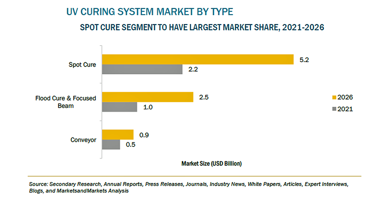 UV硬化システムの市場規模は、2021年の36億米ドルからCAGR18.6%で成長し、2026年には86億米ドルに達すると予測されています。北米のUV硬化システム市場の成長は、主に政府による大規模な資金援助プログラムによって牽引されています。さらに、高い普及率と技術の進歩も、同地域における市場の成長を後押ししています。北米地域には、Dymax(米国)、Phoseon(米国)、Baldwin Technology(米国)などの大手企業があり、同時に、EPA(環境保護庁)やAIHA(米国産業衛生協会)などの機関による厳格な規制の枠組みが、UV硬化技術の監視と商業化に重要な役割を果たしています。この地域の広大な敷地には、多くの大規模自動車メーカーや医療機器メーカーが存在しており、最大シェアを占める要因になっています。新型コロナウイルスの発生は、UV硬化システム市場にマイナス影響を与えると予想されますが、半導体・電子産業や医療分野での需要の高まりにより、2022年までには市場の回復が見込まれています。APAC(アジア太平洋)の発展途上国は、成長の可能性を秘めているだけでなく、製品メーカーにとっても有利な環境であり、今後最も高い成長率を示すと予想されています。