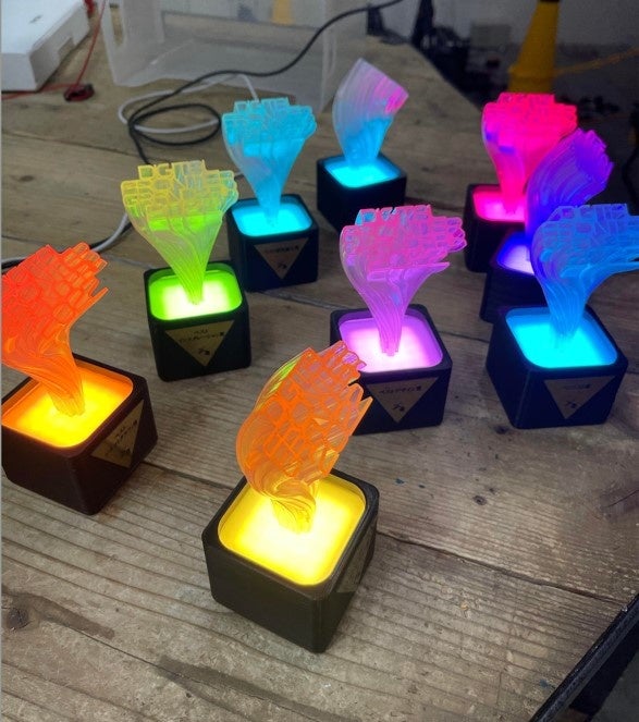 DF2022のメインビジュアルとコンセプトに合わせた形と色味で今回のトロフィーと盾を当社で制作しました。