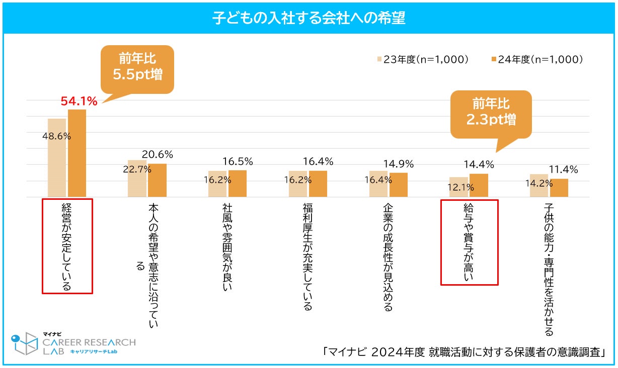 子どもの入社する企業に求める特徴は「経営が安定している」が前年につづき最多