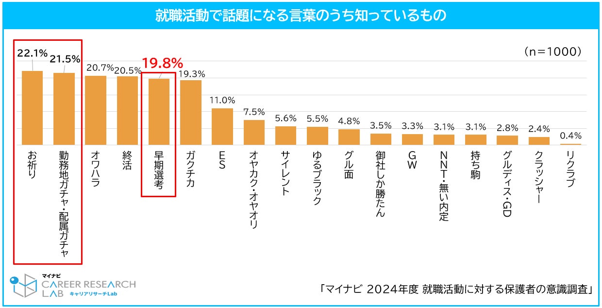 保護者が知っている「話題の就活ワード」は、「お祈り」「勤務地ガチャ・配属ガチャ」