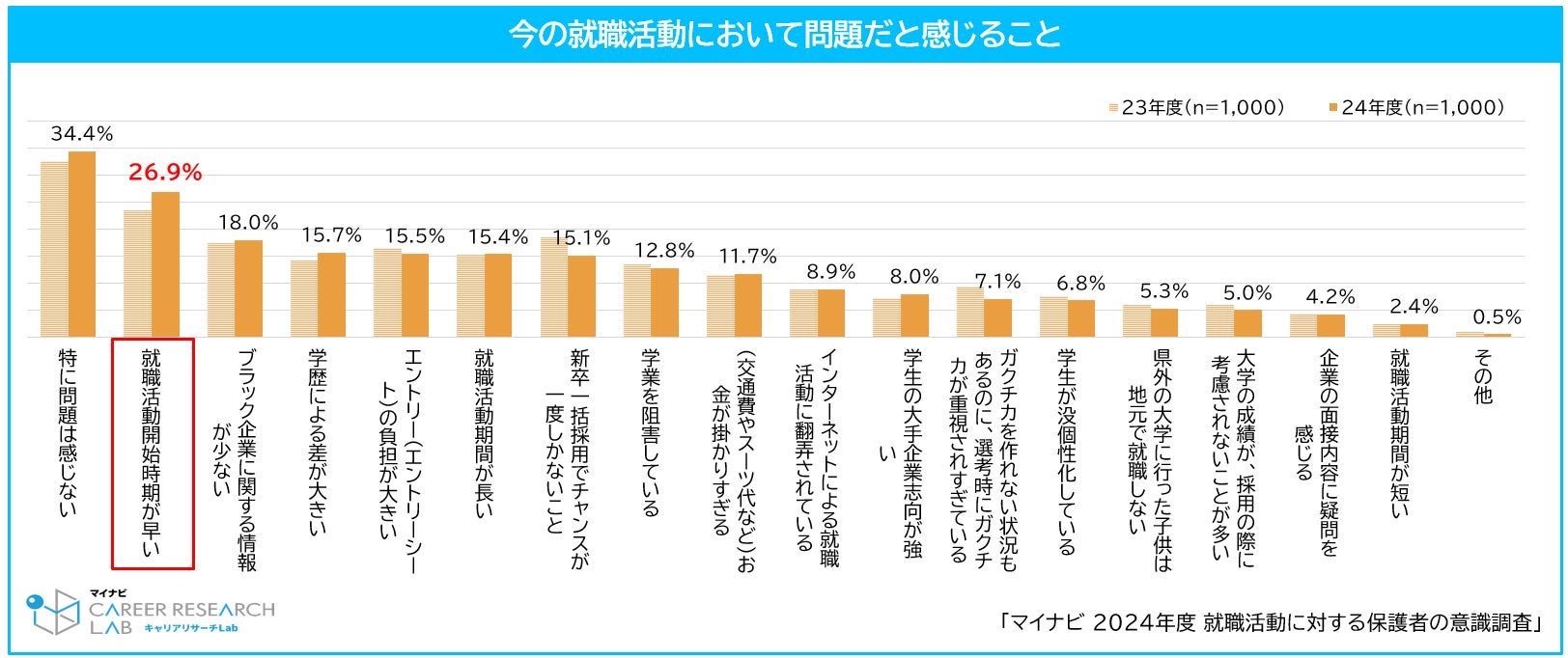 今の就職活動について問題だと感じることは「就職活動開始時期が早い」(26.9%)が最多で、昨年よりも増加した。就職活動のスケジュールは、大学3年生の3月に企業の採用広報活動の開始、4年生の6月に企業の選考の開始というものが正式だが、それよりも早く採用選考を行う企業もあり、大学3年生の3月の時点で既に内々定を保有している学生もいる。「早期選考」という言葉の認知度や就職活動開始時期が早まることによる学業の圧迫などの問題意識から、就職活動が始まるのが早いと感じる保護者がいることがわかる。【図1、2】