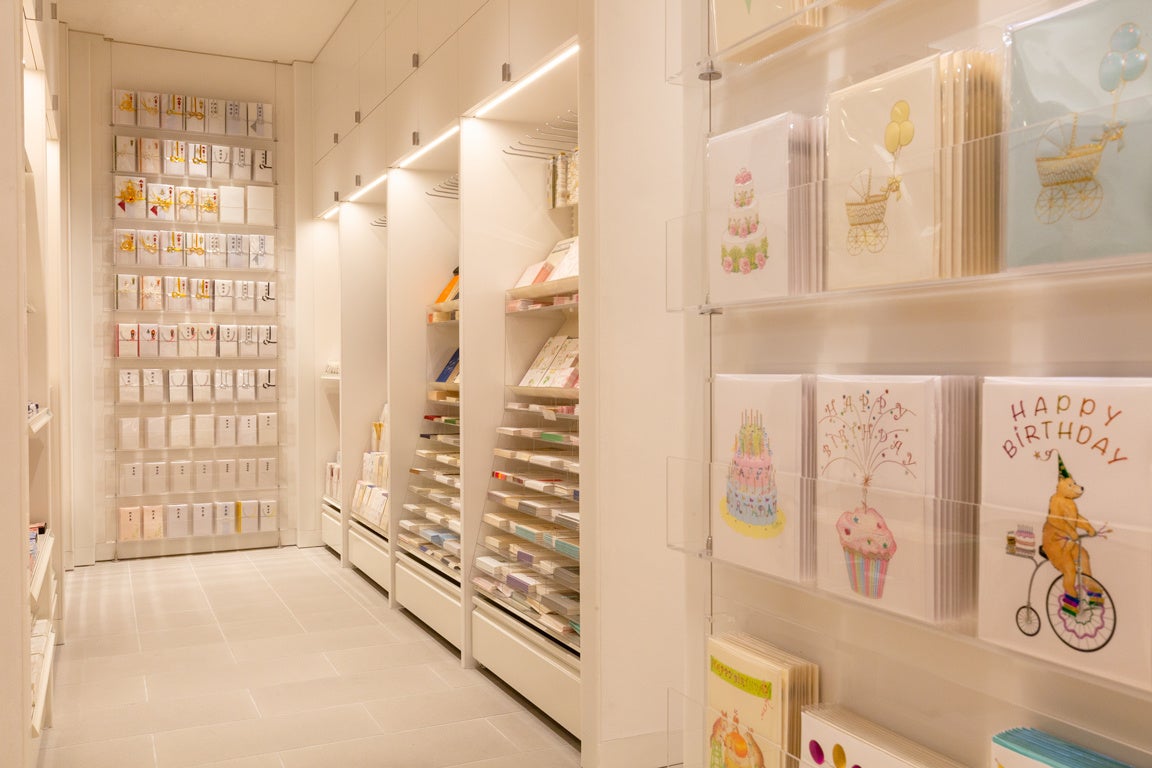 「人々が集まる場所に、人々が必要とするものを」というコンセプトのもと、オープンで明るい印象のセミセルフスペースと、セミクローズの落ち着いた筆記具スペースを兼ね備えたゆったりとした空間に、ご要望の高い祝儀袋・便箋・カードはもちろん、近年日本橋周辺で増加するニューファミリー層にも人気のある文具や雑貨まで幅広く取り揃えました。