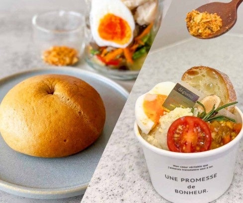 野菜ソムリエのmameさんと、産後-20kgのダイエットレシピを発信するkuruminさんがプロデュースするSNSのダイエットサークル「mamekuru cafe」。ダイエット中の食事が幸せになるように、椎茸出汁と焼大豆フレークをたっぷり使った、栄養と旨みたっぷりの保存料・着色料無添加のオリジナルスパイスを開発しました。そのようなスパイスを楽しめるよう、今回のイベントのために考案されたメニューが、スパイスをふりかけて食べるパフェ風デリポテサラダ。マッシュポテトにオイル不使用の鶏むねタコミートを合わせ、高タンパク・低カロリーなデリサラダに仕上げました。また、mameさんがレシピ開発担当した、ブランド「OatsMii(オーツミー)」のベーグルも登場。小麦を一切使わずにオートミールで作っています。タンパク質と食物繊維が豊富な点が特徴。