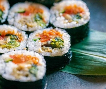 肉や魚、卵、乳製品を使わず、ヴィーガン(※)フードやプラントベースフードのお店から。ピロール農法で育てられた石川県産コシヒカリを使ったキンパは、ごま油の風味が後を引くおいしさです。