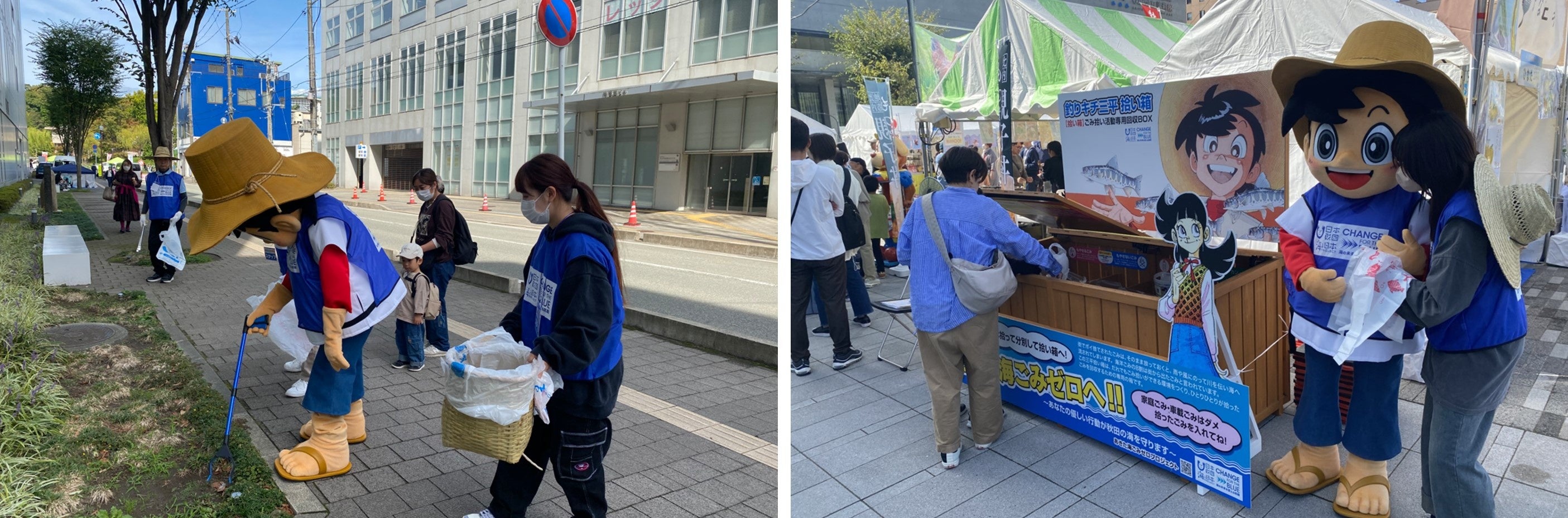CHANGE FOR THE BLUEオリジナルごみ袋を会場の方々に配りながら、清掃活動も頑張る三平くん。三平くんの周りには、「釣りキチ三平だ」と懐かしむ大人はもちろん、三平くんを知らない子供たちも三平くんとハグをしたり、「かわいい」とたくさんの子供たちが集まり写真撮影や、ハイタッチをするなど大人気の三平くん。三平拾い箱の前では、拾い箱の中をのぞきこんだり、三平やゆりっぺと写真を撮る子供や、矢口先生の描いた貴重な画を懐かしそうに眺める大人などが見受けらました。来場者の中には、配布されたごみ袋を使って会場周辺のごみ拾いを行い、拾い箱で分別しながらごみを捨ててくれる家族連れや子供達もいたことから、少しずつ県民のごみに対する意識が向上してきていることを嬉しく感じました。