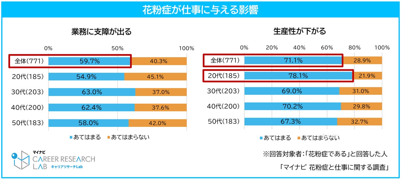 20代の2人に1人以上は「花粉症が転職活動に影響している」と回答。影響は「転職時期の調整」「応募職種・業種の変更」など。花粉症である正社員の約7割が「花粉症で仕事の生産性が下がる」と回答